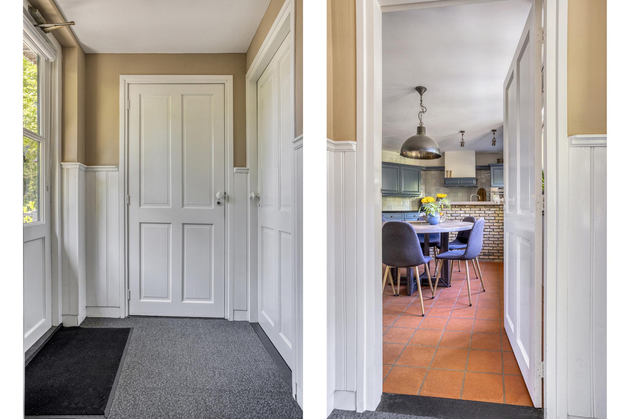 Wanneer je je auto op de parkeerplaats op eigen terrein hebt geparkeerd loop je naar de voordeur aan de voorzijde van de woning. In de hal is de garderobe als ook de vaste trap naar de 1e verdieping. Hier is ook de meterkast (2 aardlekschakelaars, 10 lichtgroepen en 2 krachtgroepen). De woning heeft een glasvezelaansluiting van Midden Brabantglas (met contract). Vanuit de hal is de woonkamer als ook het kantoor te bereiken.