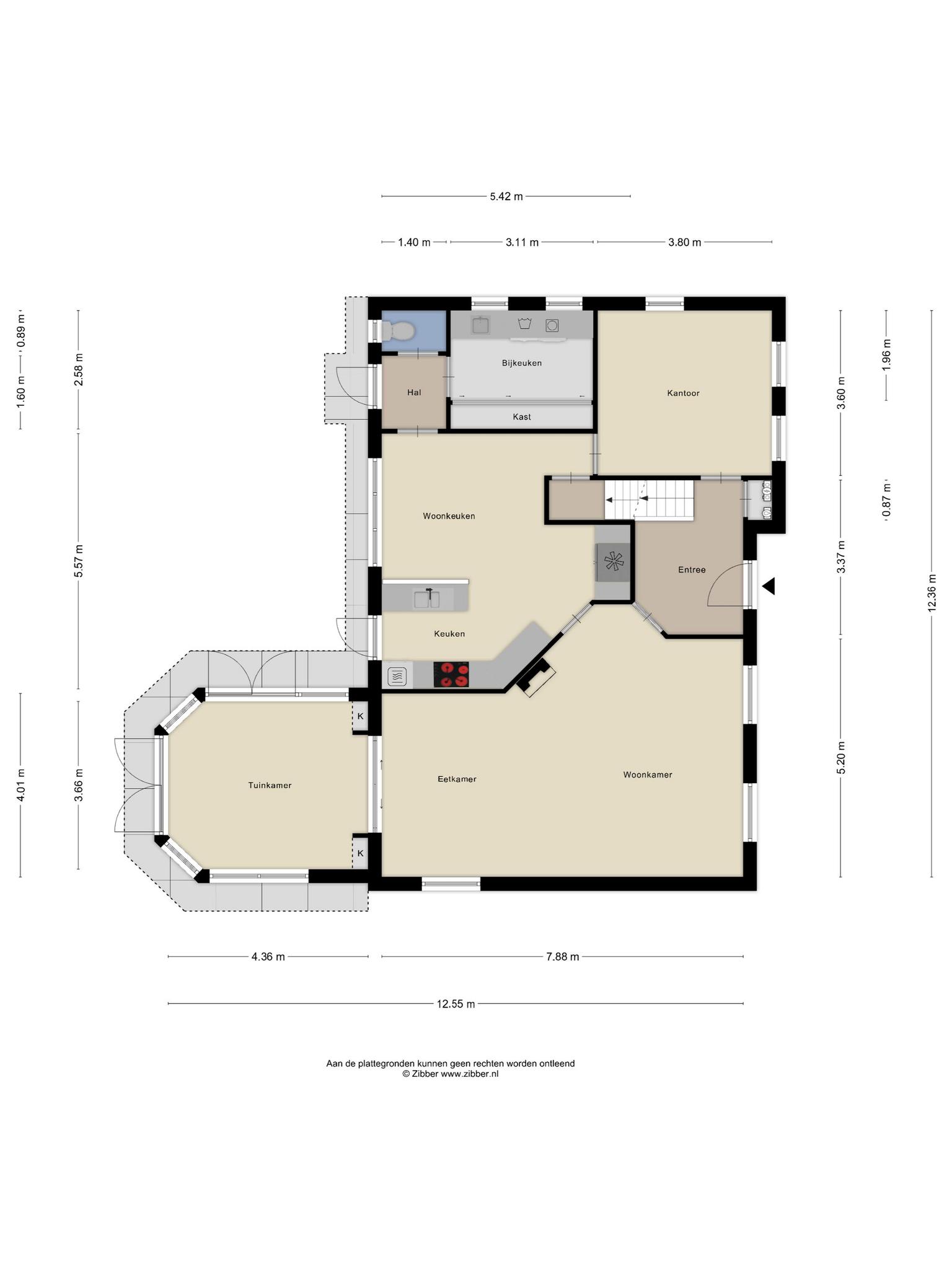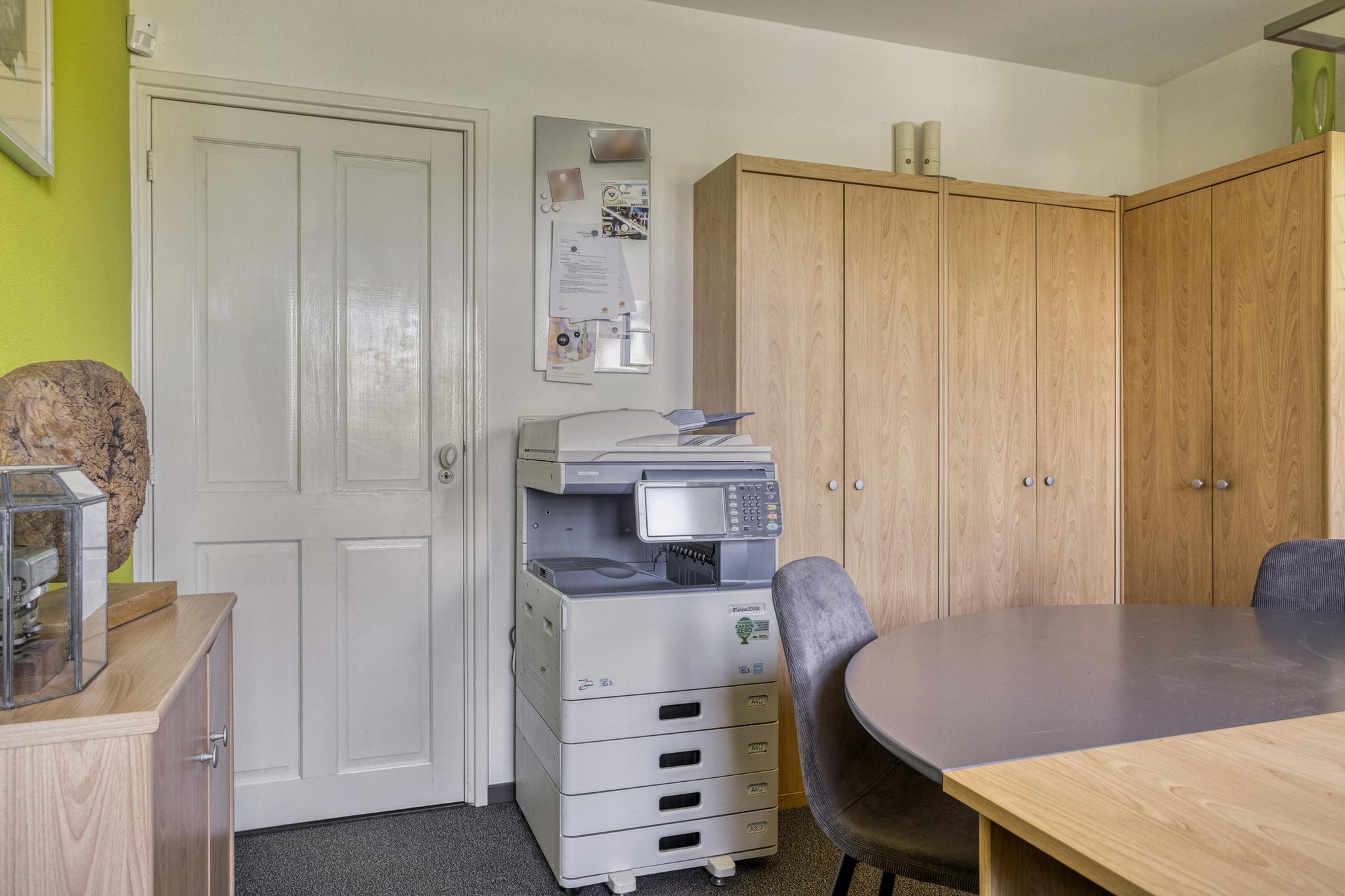 Aan de voorzijde is het kantoor (3.60 x 3.80 m) gelegen welke bereikbaar is via de hal en de keuken. Ideaal voor een beroep aan huis, maar deze ruimte kan ook uitstekend gebruikt worden als een hobby- of speelkamer.