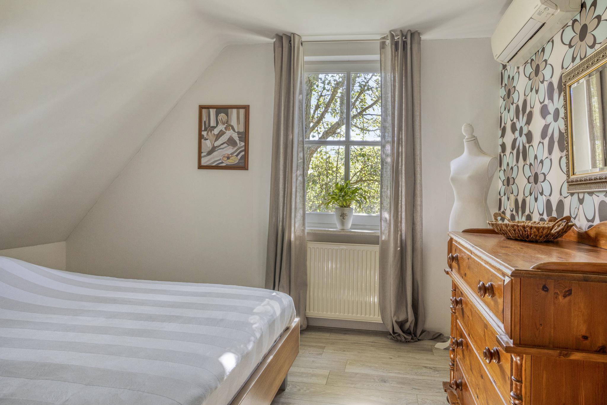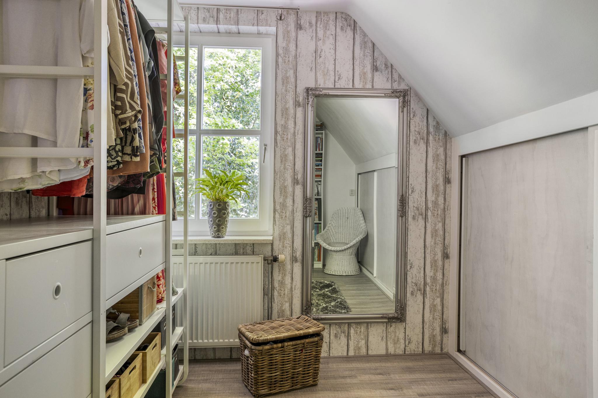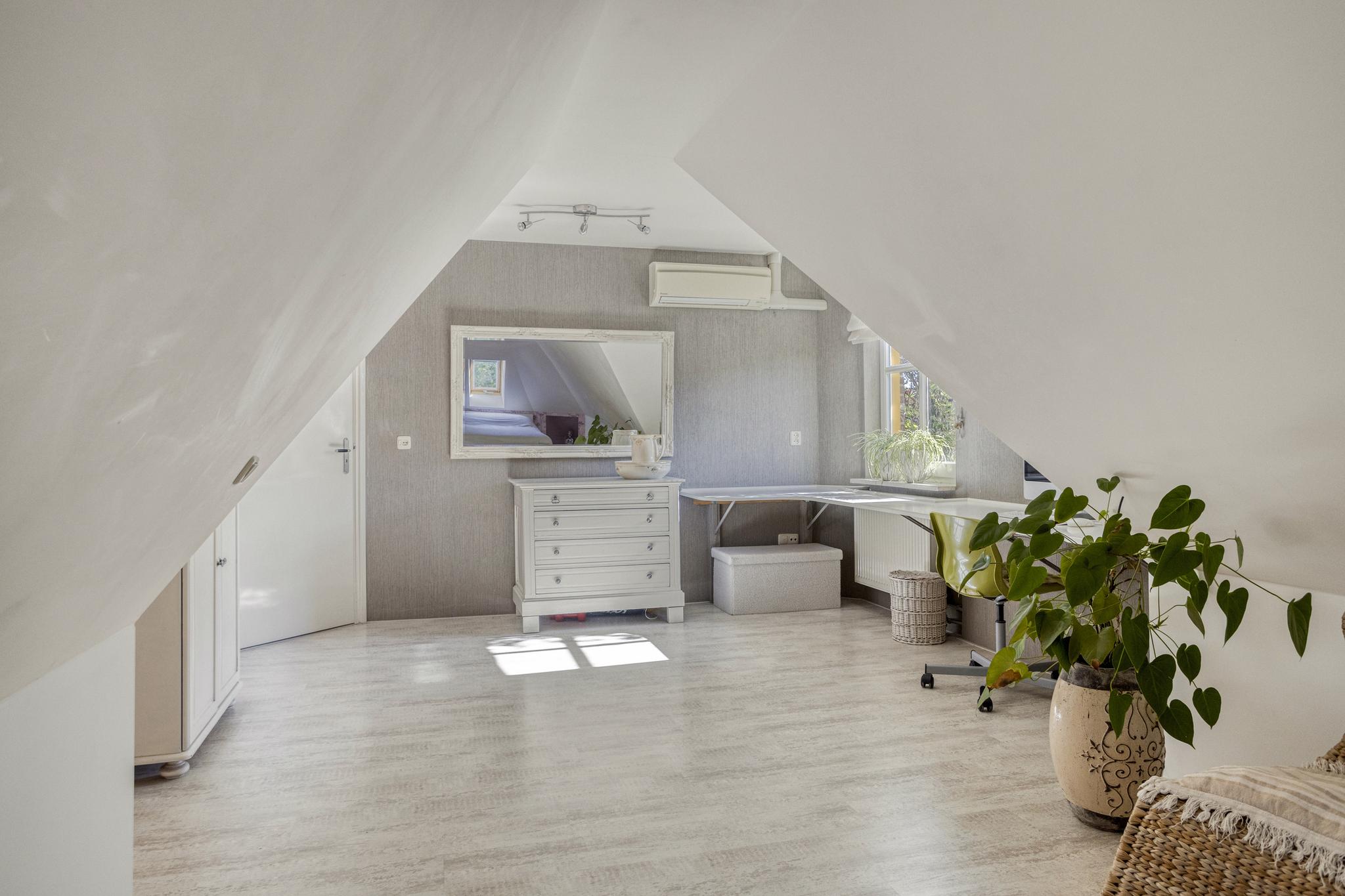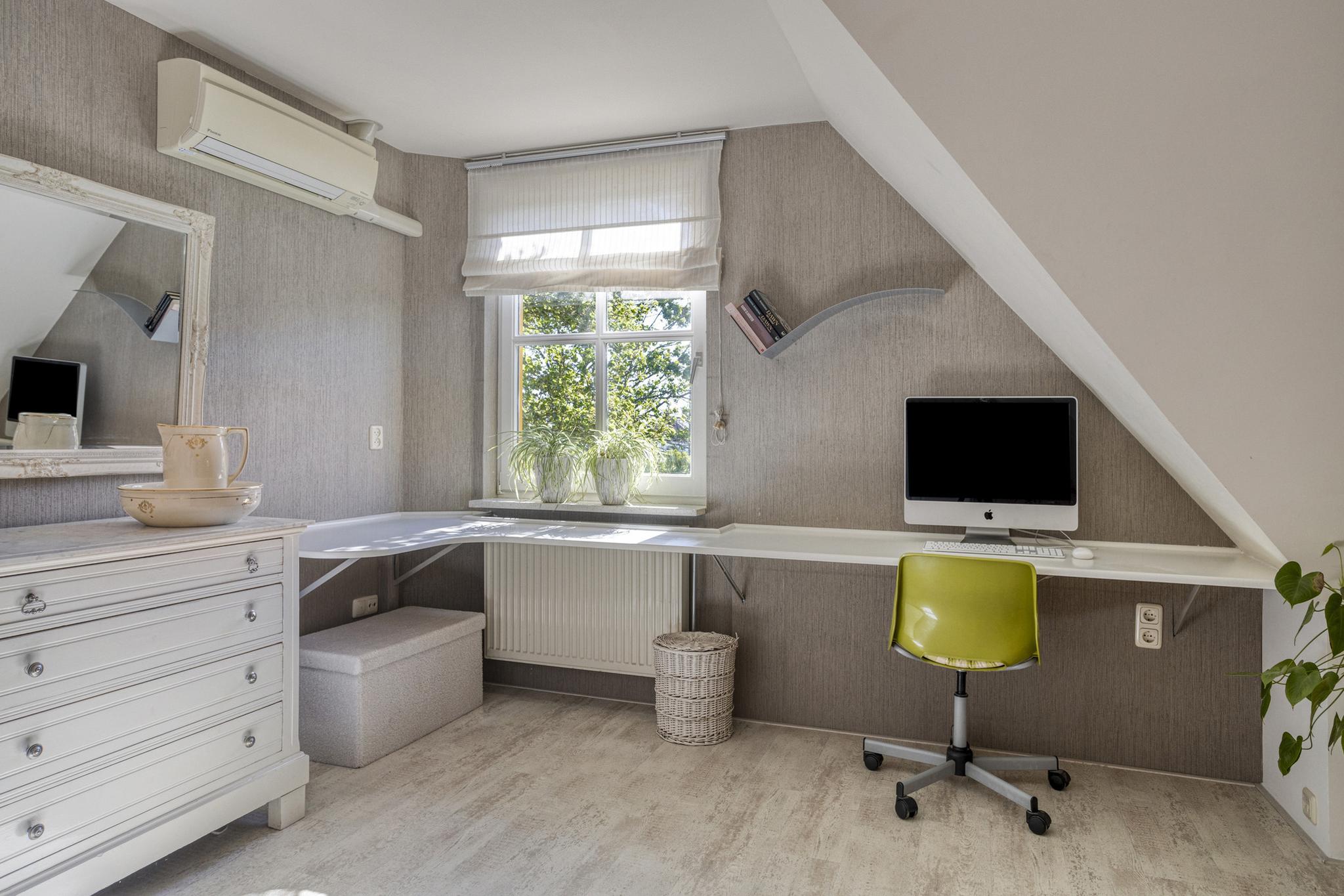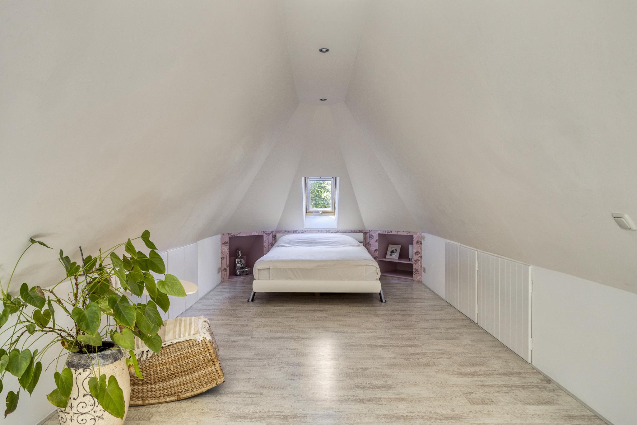 Op de eerste verdieping bevinden zich maar liefst vijf slaapkamers, waarvan enkele met uitzicht op de groene omgeving. De ruime badkamer is voorzien van een dakkapel, wat zorgt voor extra lichtinval en een fraai zicht op de achtertuin. Via een vlizotrap is de bergzolder op de tweede verdieping bereikbaar: een ideale plek voor opslag.