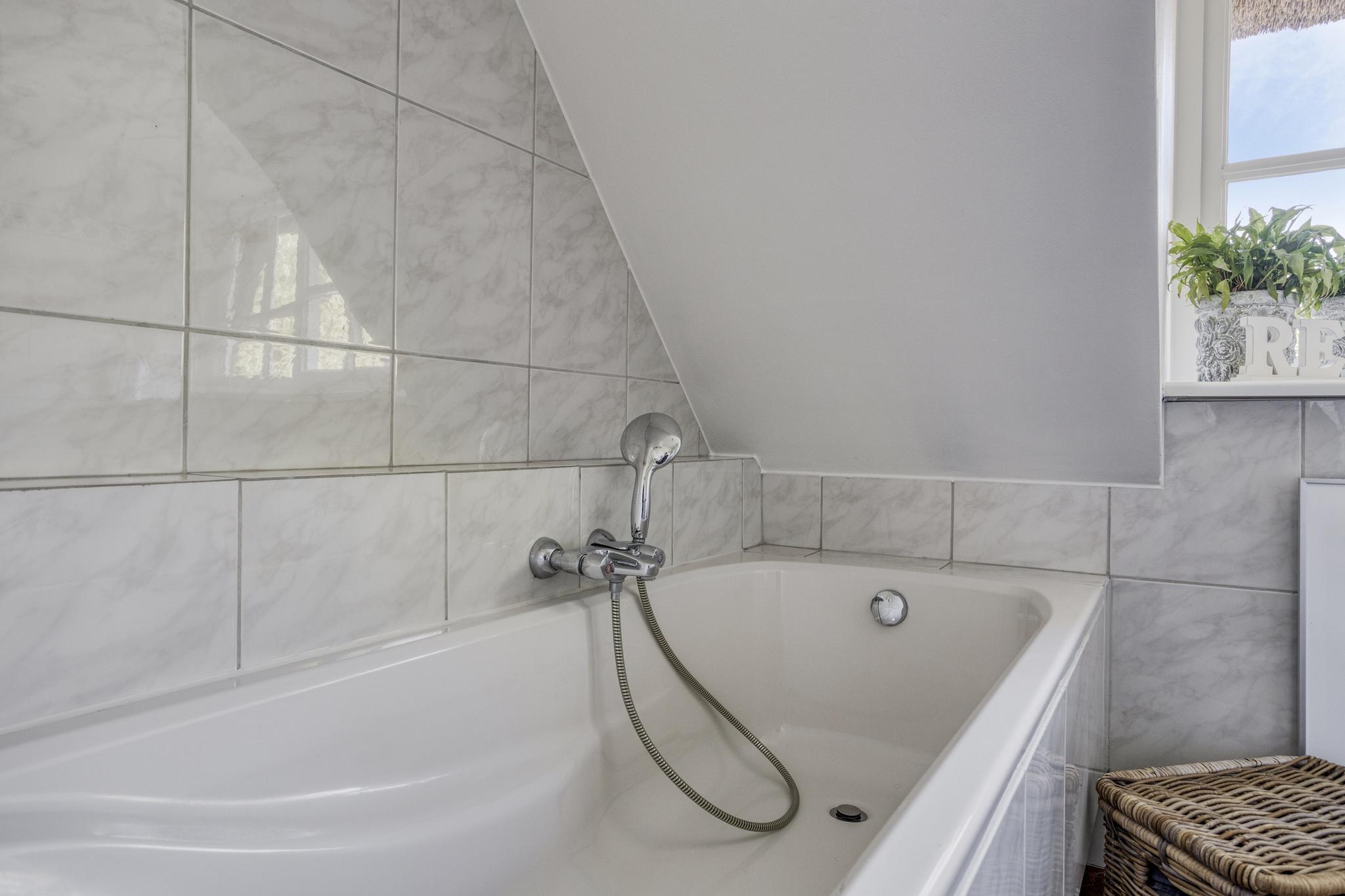 Aan de achterzijde op de 1e verdieping is de ruime badkamer. De dakkapel zorgt voor veel licht maar ook geeft deze een prachtige uitzicht over de achtertuin. De badkamer is volledig betegeld en voorzien van vloerverwarming. Verder is er een ligbad en een separate douche. Er is een dubbel wastafelmeubel met spiegel.