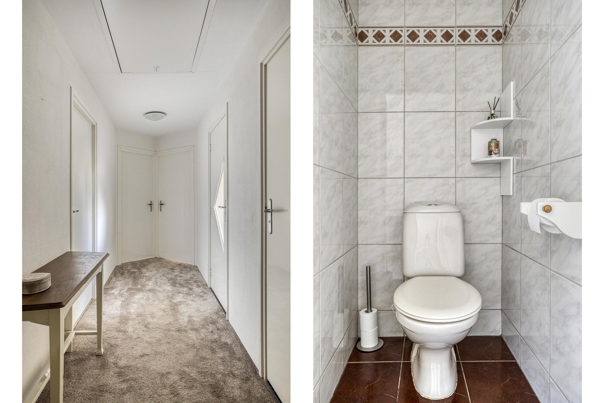 Op de overloop is er een apart toilet welke ook volledig is betegeld.