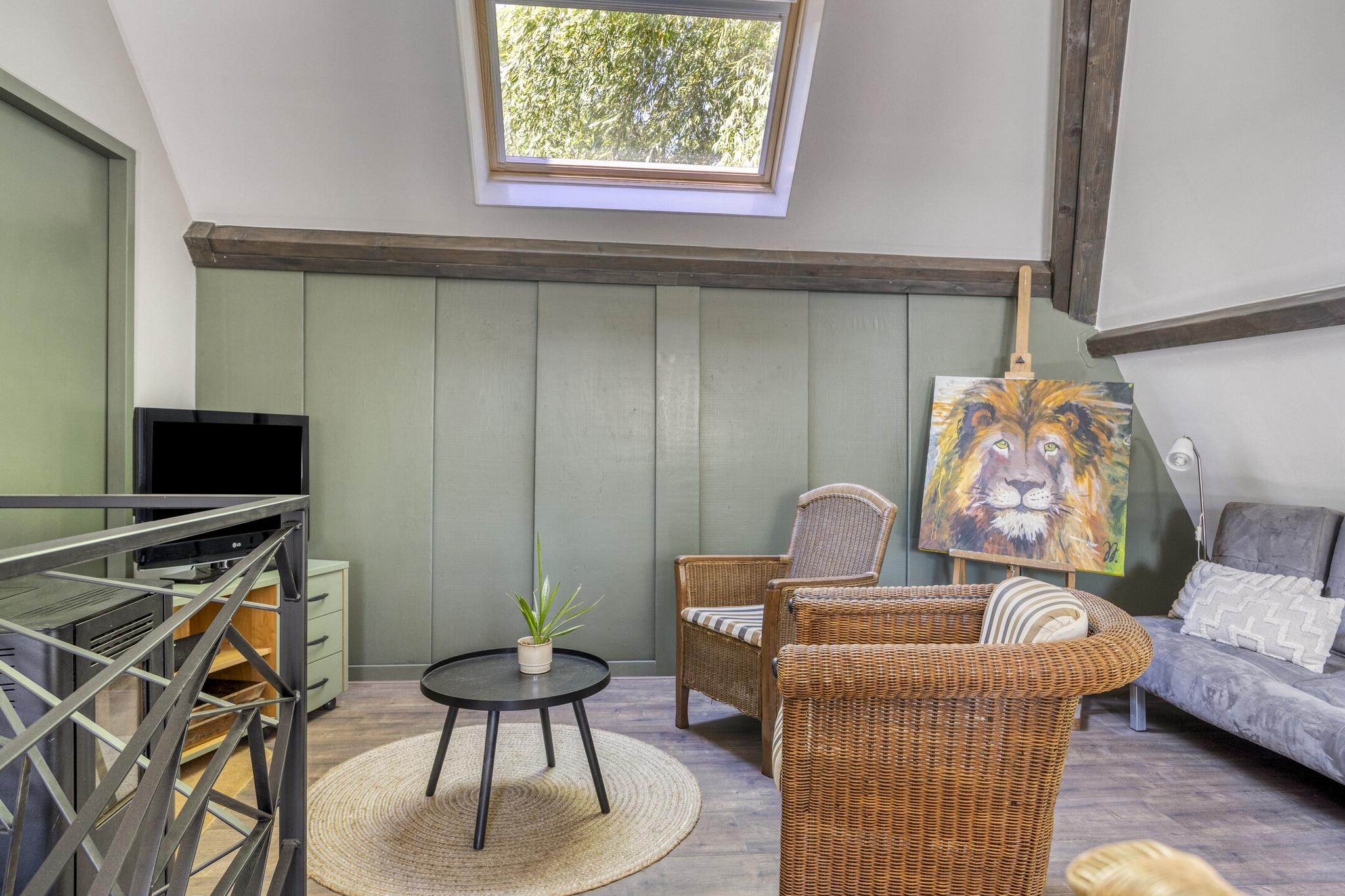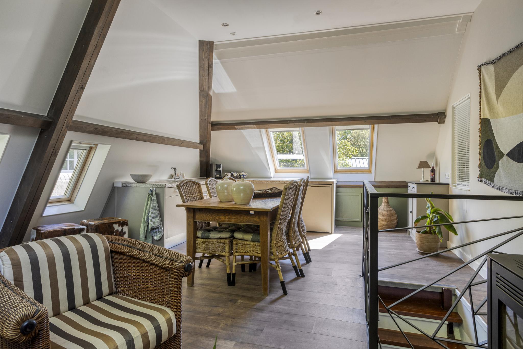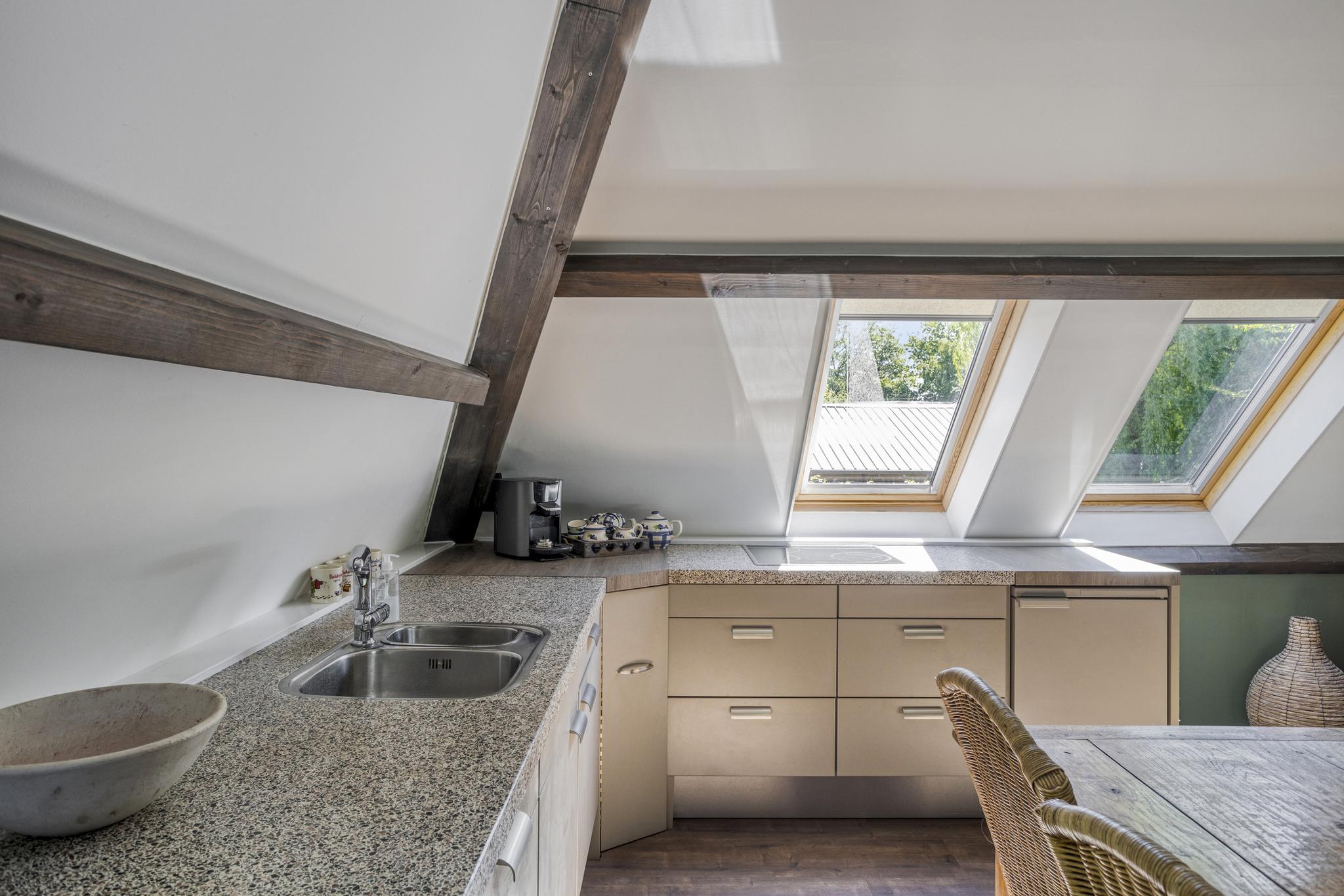 Via de vaste trap ga je naar de 1e verdieping. Hier is de woonkamer met open keuken. De keuken is uitgerust met een keukenblok met inductie kookplaat, een koelkast en een ingebouwde vaatwasser. De ruimte is heerlijk te verwarmen met de pelletkachel. Vanuit de woonkamer is de vliering in de schuur bereikbaar.