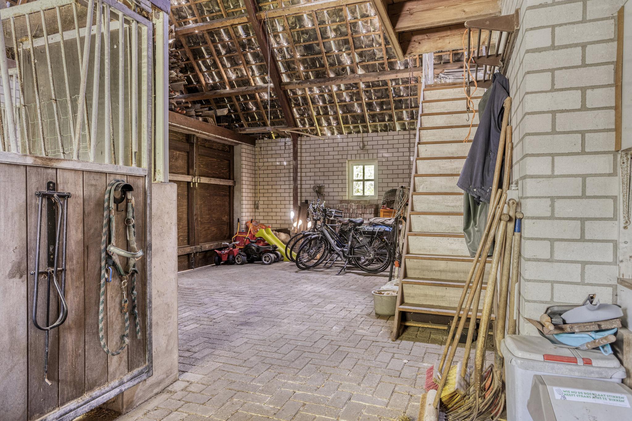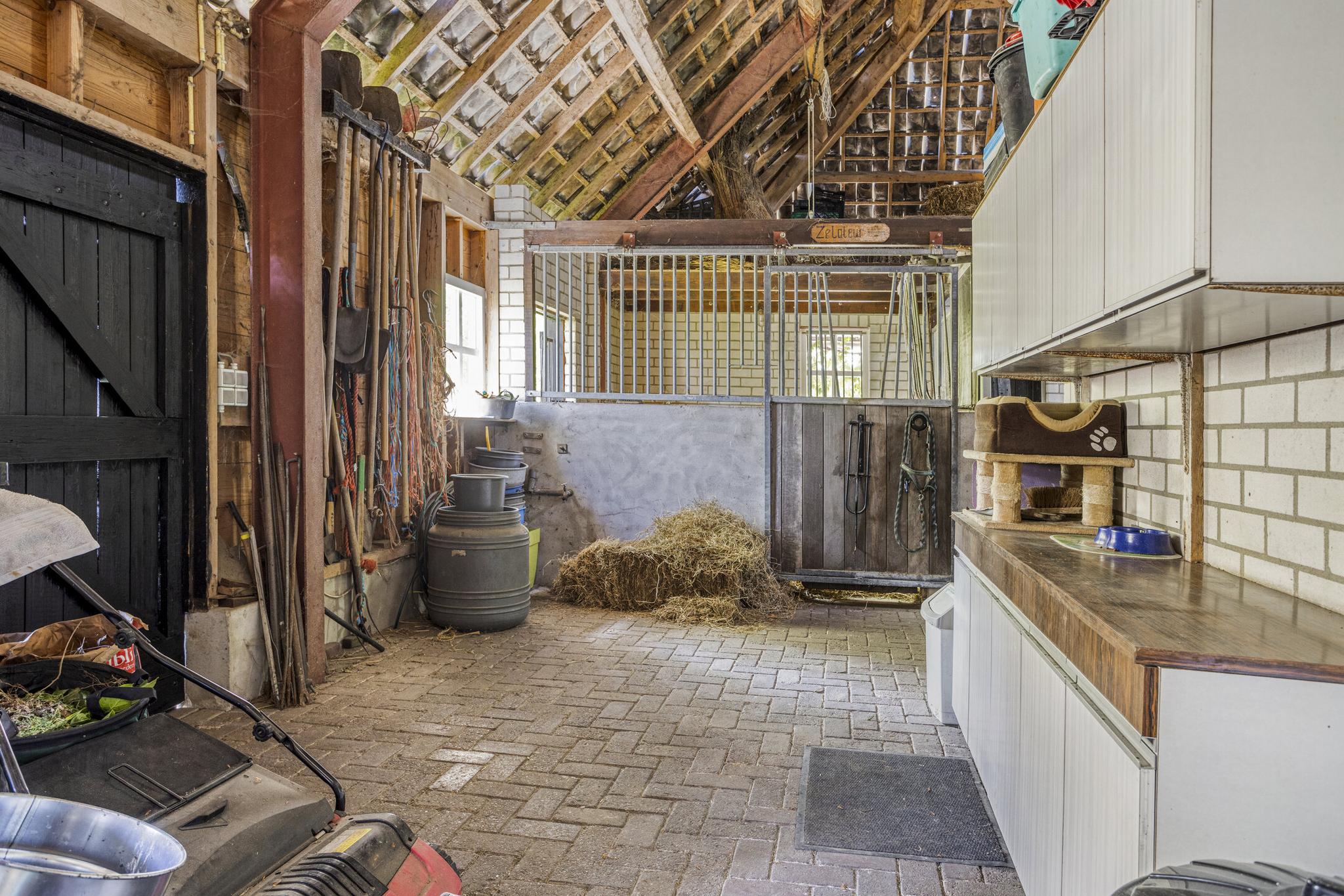 Aan de achterzijde van de schuur is er onder andere een paardenbox. Onder de trap is er een afsluitbare zadelkast. Verder is er veel ruimte wat voor veel doeleinden geschikt is. Hier kunnen eventueel extra paardenboxen gecreëerd worden. Aan de achterzijde van de schuur zijn er dubbele deuren, zodat de schuur ook toegankelijk is voor groot materieel. Op de schuur liggen 30 zonnepanelen.