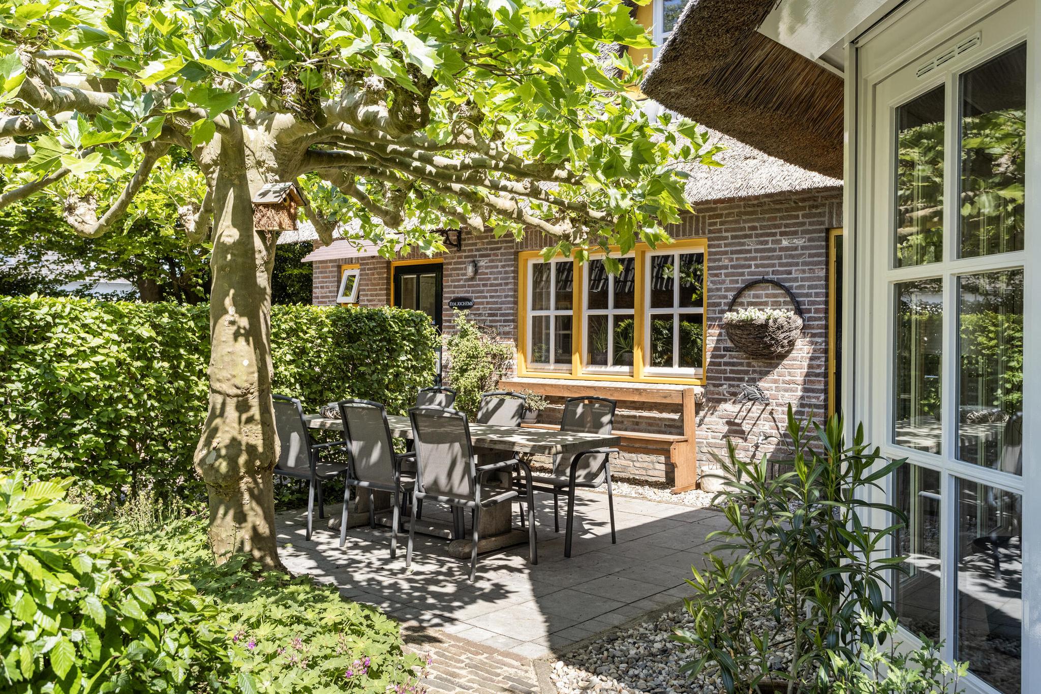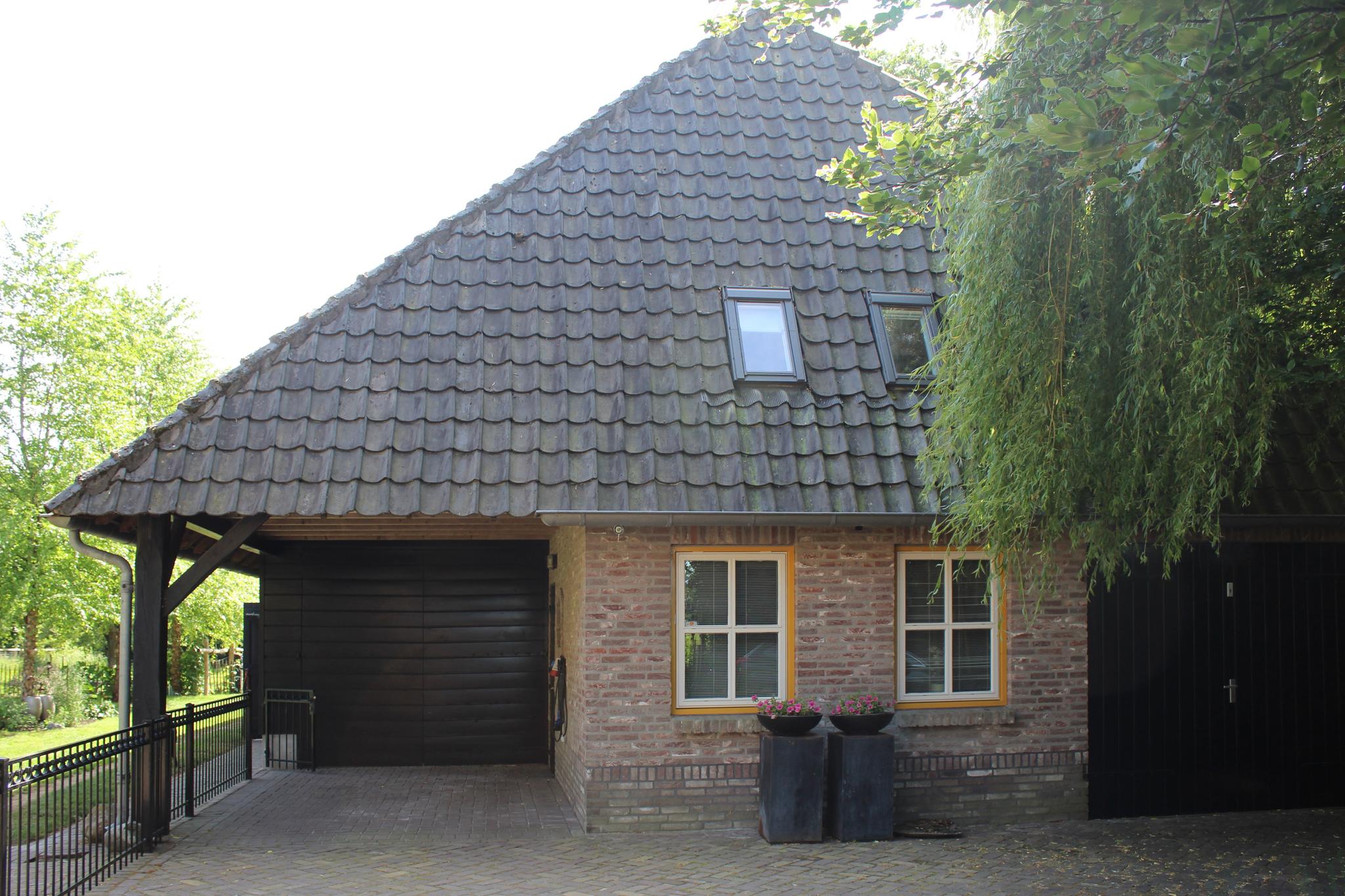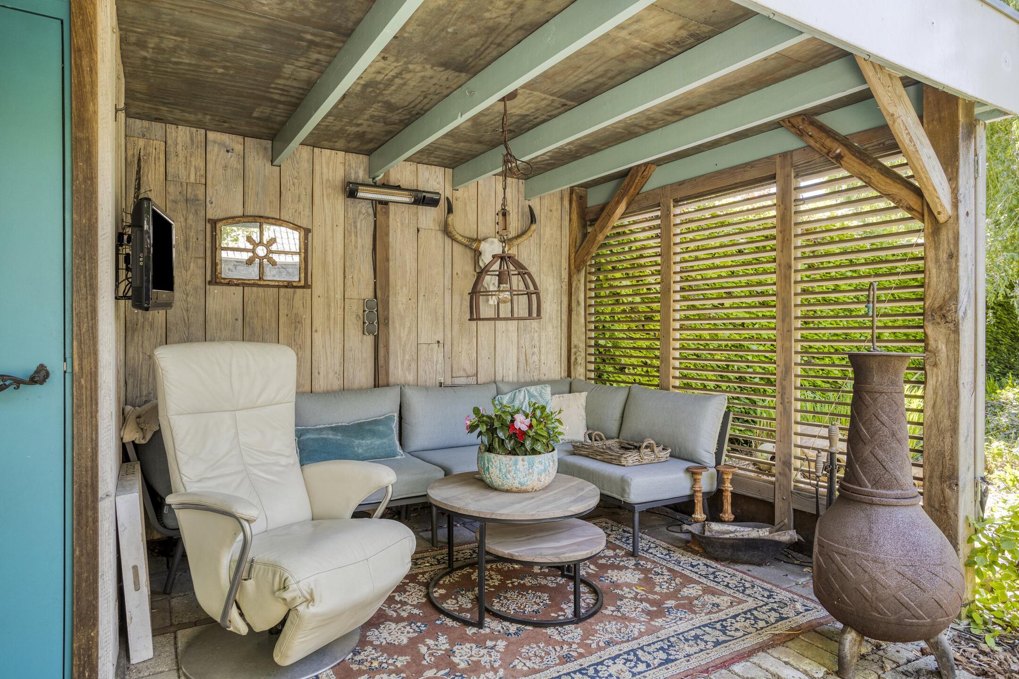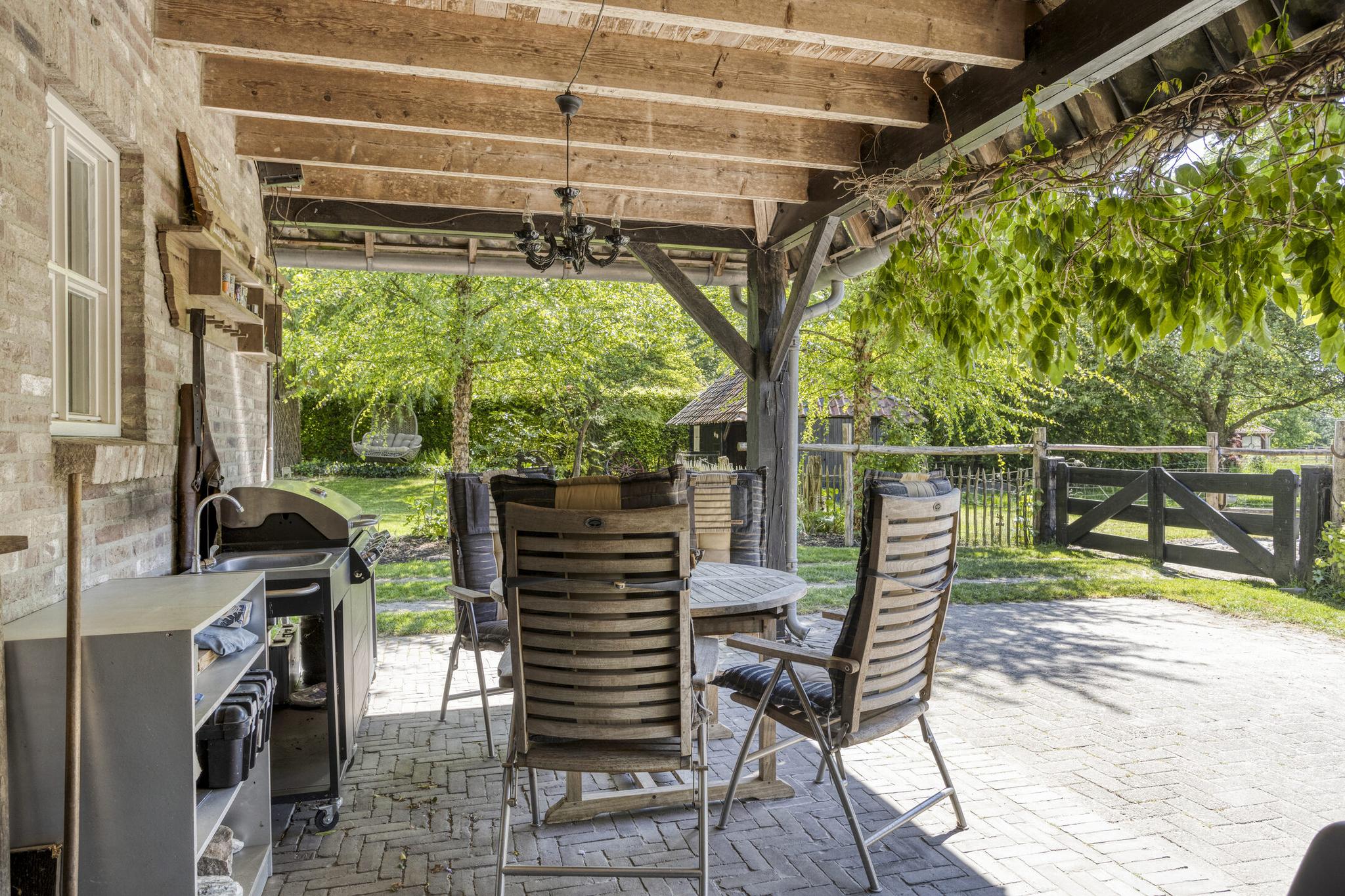 Aan de voorzijde is een royale overkapping aanwezig, terwijl de achterzijde van de schuur een overdekt terras met buitenkeuken herbergt — dé plek voor lange zomeravonden.