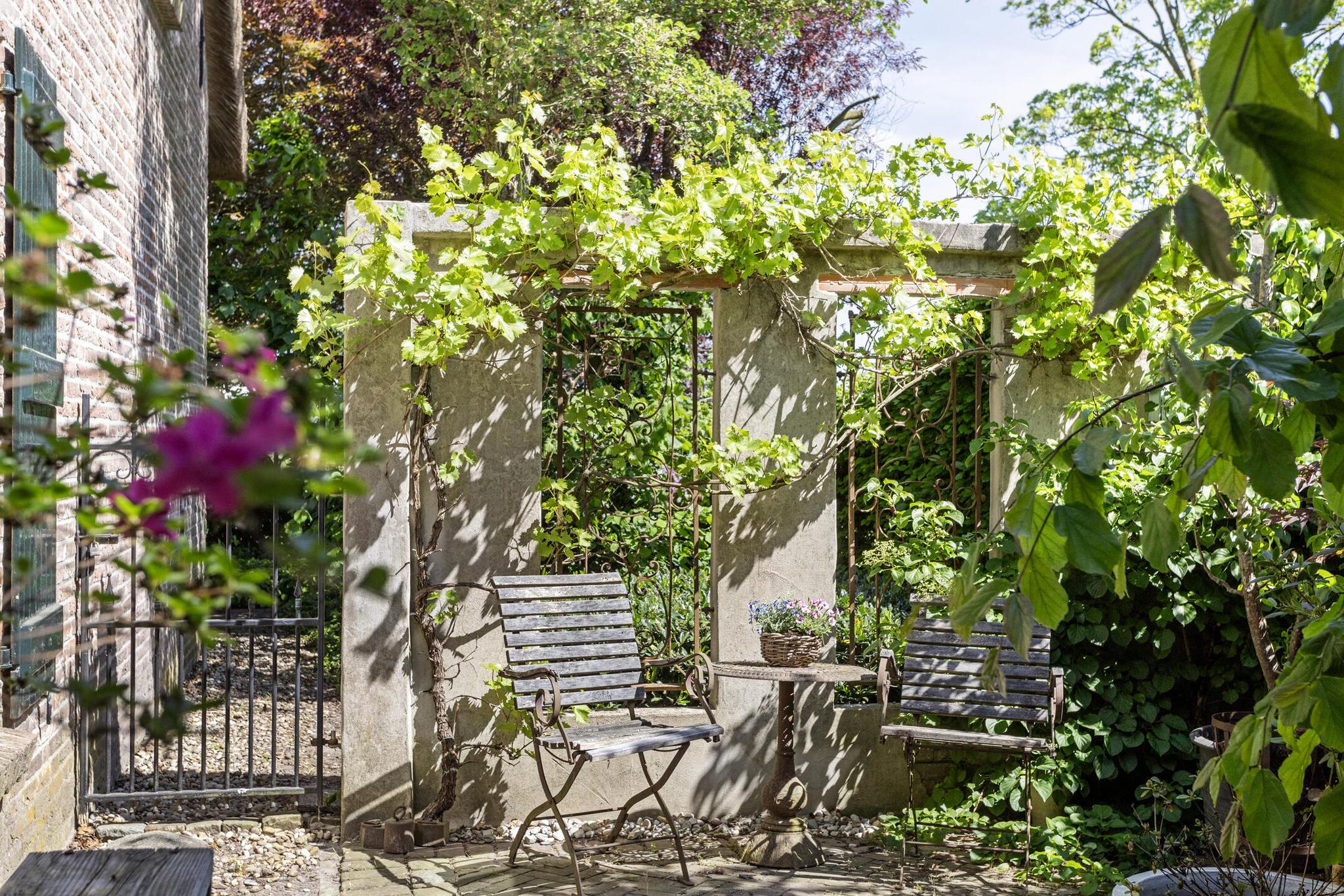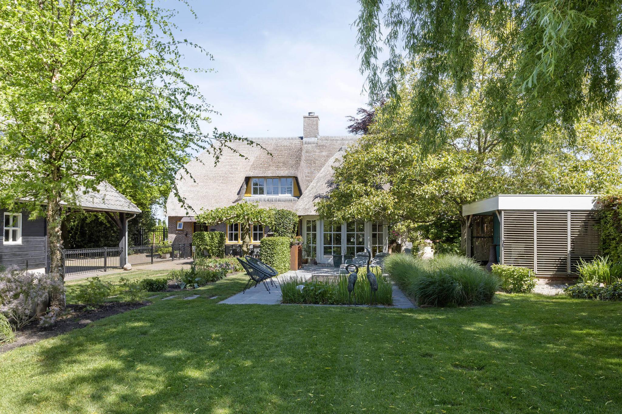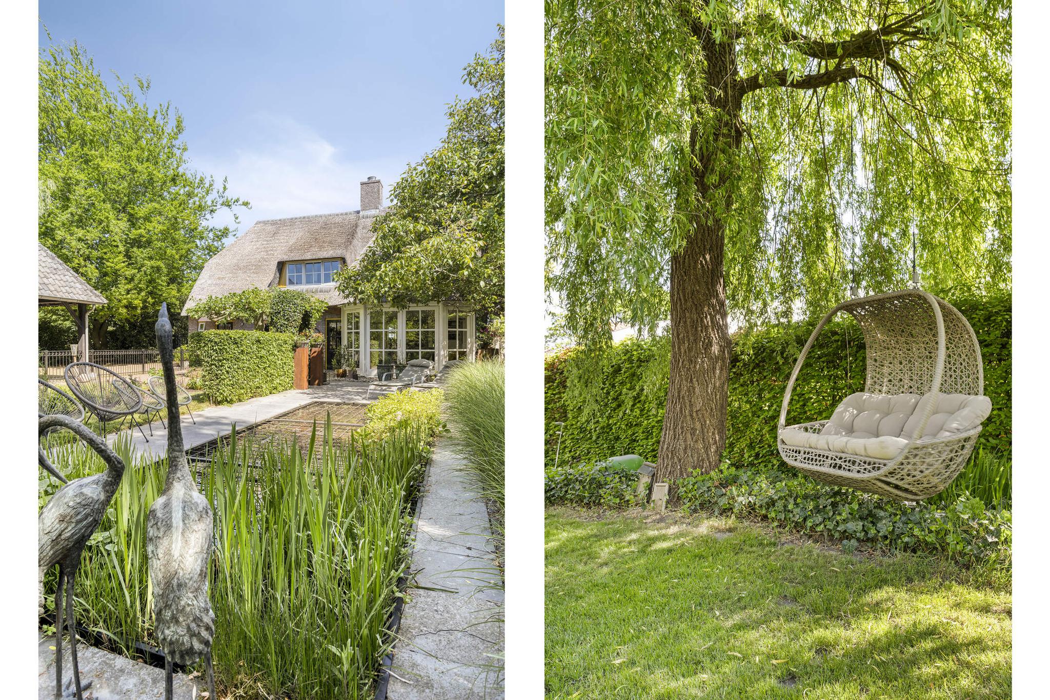 De tuin rondom de woning is groen, volwassen en zorgvuldig aangelegd met onder andere volgroeide bomen, diverse struiken, een vijver en een gezellige overkapping. De oprit is voorzien van een elektrisch bedienbare poort en aan de andere zijde van het perceel zorgt een ijzeren poort ervoor dat de achtertuin volledig afsluitbaar is.