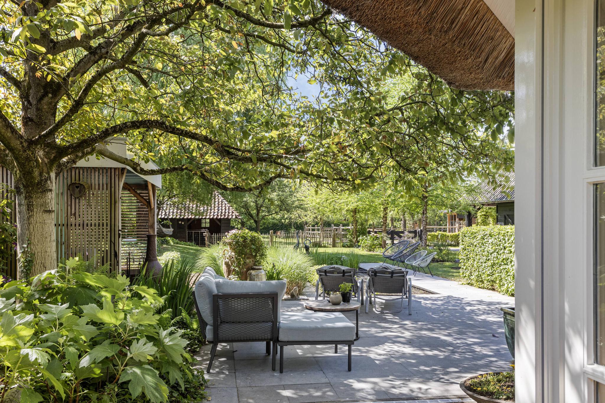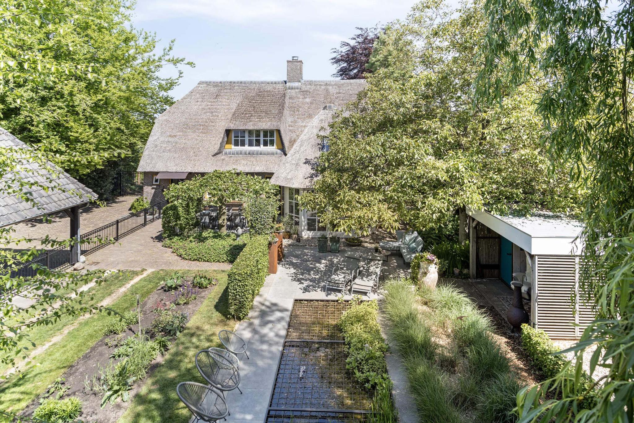 Achter de woning staat een overkapping met terras. Een prachtige plek om te genieten van de groene tuin en vijver. Achter op het perceel is een dieren/paardenweitje gelegen en staat er een schaapskooi. Er is ook een paddock/kleine rijbak aanwezig, dus een perfecte plek voor de paardenliefhebber. De achterzijde van de schuur heeft een overkapping waaronder een heerlijk terras met buitenkeuken is gesitueerd.