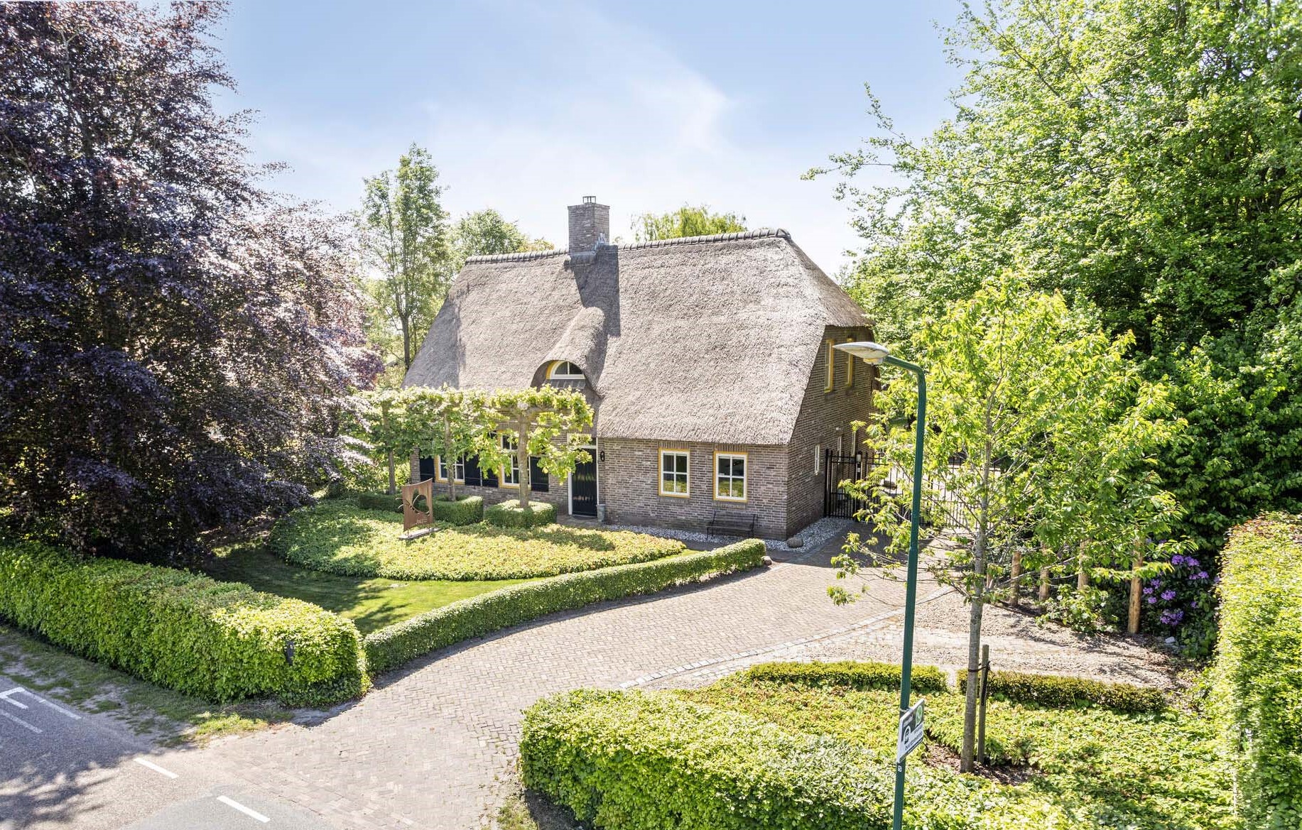 De woning en schuur zijn gelegen op een ruim perceel van 3.140 m². Aan de voorzijde is de tuin smaakvol ingericht, waarbij de grote beuk en de leilinden de blikvangers zijn. Verder is de voortuin omzoomd met hagen en bestaat grotendeels uit een gazon. De voortuin is voorzien van een beregeningsinstallatie met automatische sproeiers. Er is een eigen bron op het terrein aanwezig voor de sproeiinstallatie. Rechts van de woning is er een bestrate oprit met een parkeerplaats naast de oprit. De oprit leidt naar het achterterrein de grote schuur. Er is een elektrisch bedienbare dubbele poort en een looppoort.