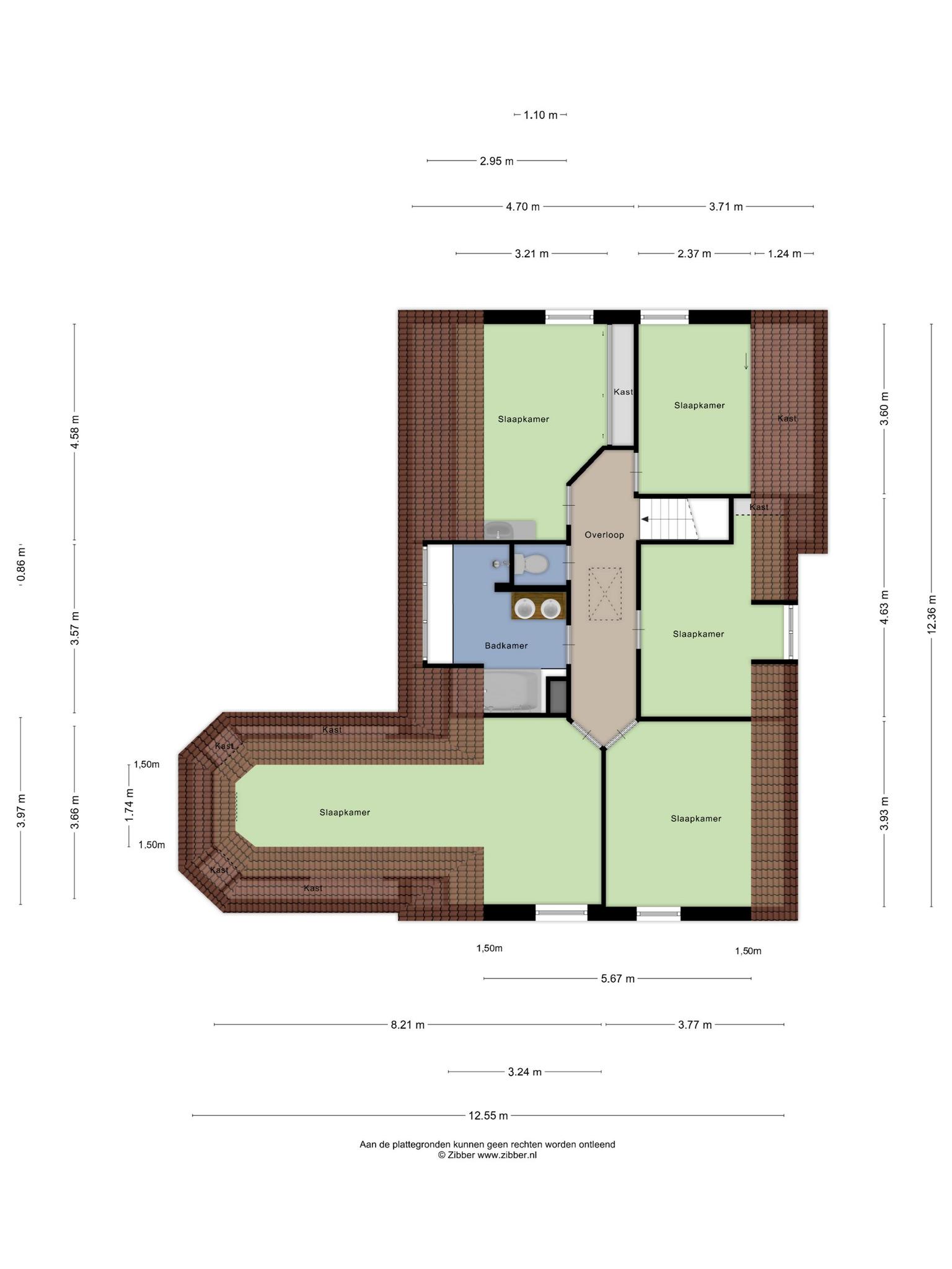 De overige slaapkamers hebben respectievelijk de volgende afmetingen: ca. 3.00 x 3.93 m, 2.37 x 4.63 m, 2.37 x 3.60 en 3.21 x 4.58. Deze laatste is voorzien van een wastafel met warm- en koudwater. De vloeren zijn voorzien van laminaat. Er zijn diverse inbouwkasten aanwezig.