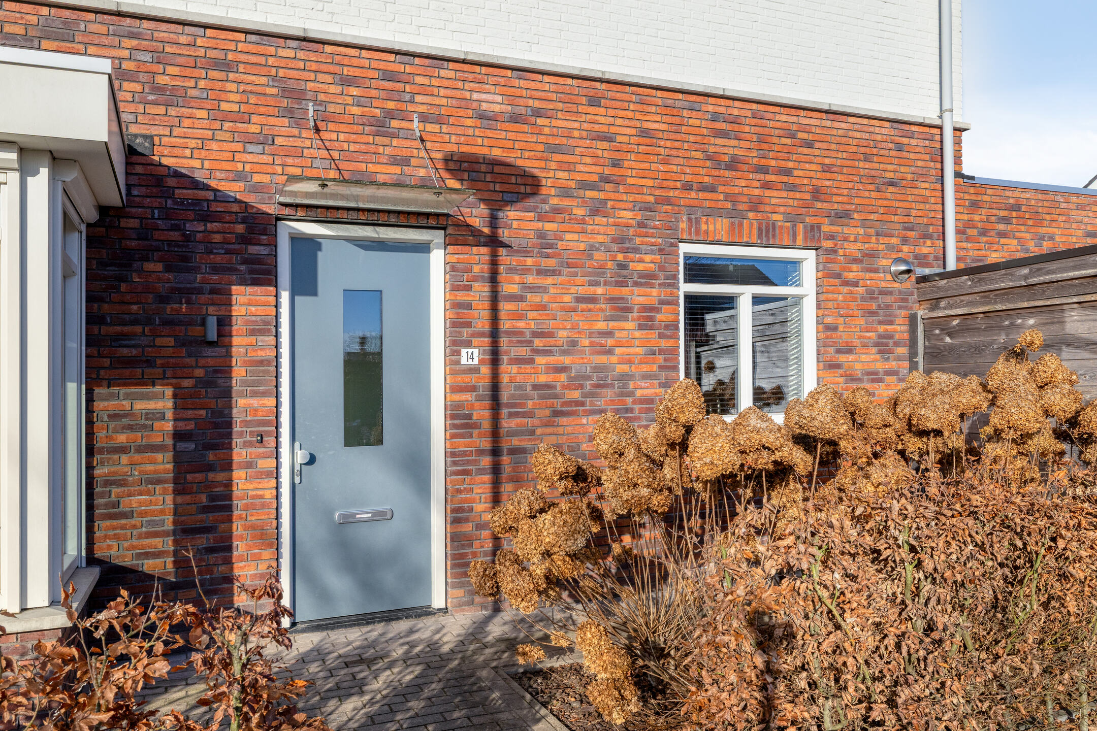 De woning is op een hoek gelegen. Er is een tuin aan de voor- als zijkant welke omzoomd is met een beukenhaag. Verder zijn de borders voorzien van planten. Links van de woning is er een voetpad naar de achtertuin welke afgesloten wordt met een poort.
