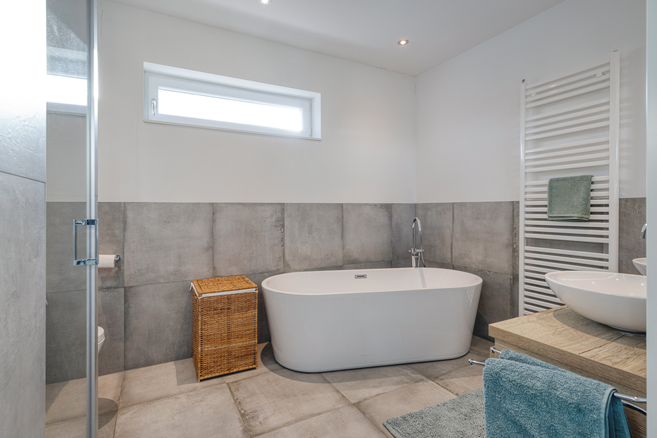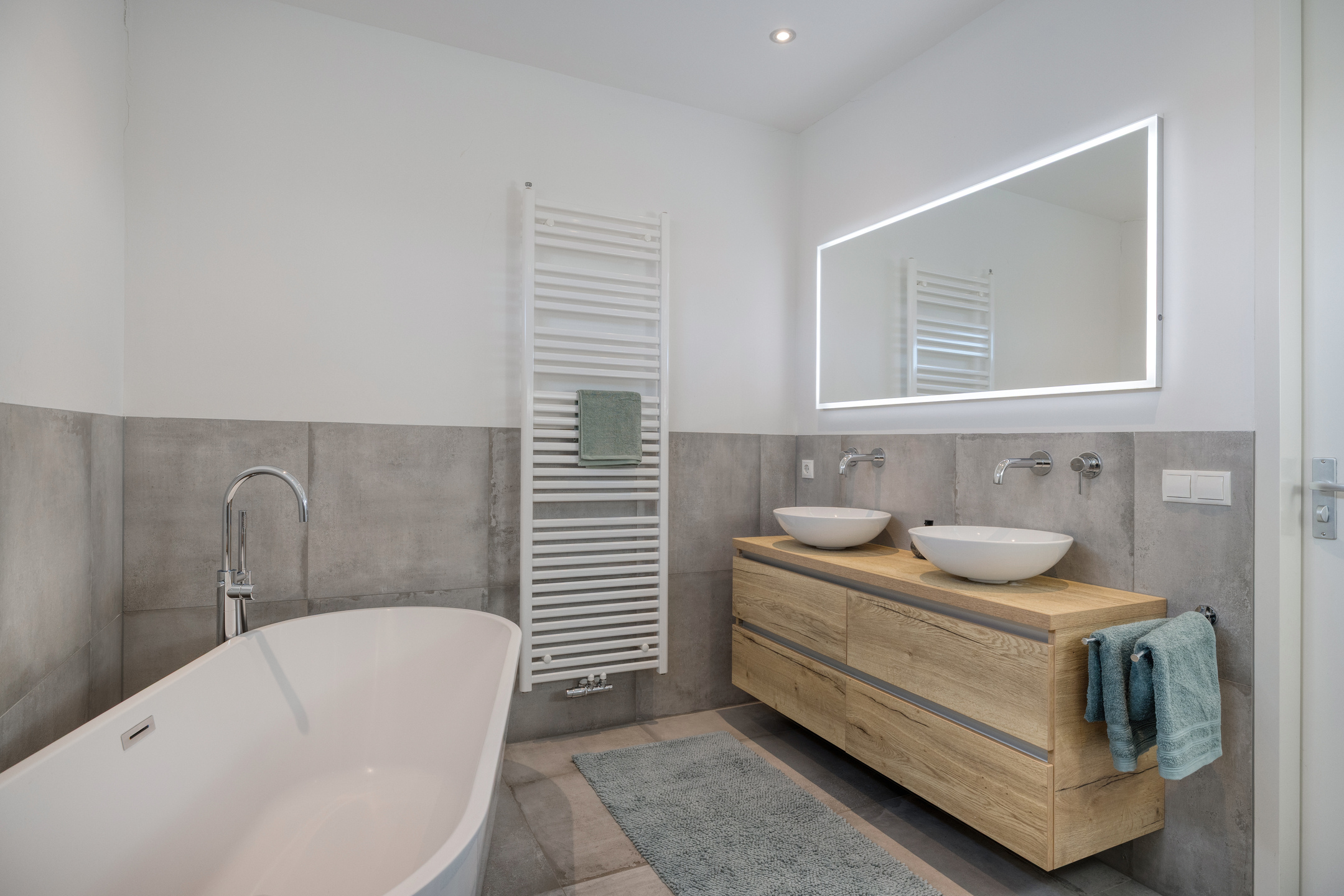 Centraal op de 1e verdieping is de ruime badkamer met een afmeting van ca. 2.49 x 3.75 m gesitueerd. Het is een luxe badkamer welke voorzien is van een ligbad, een inloopdouche met glazen wand, een zwevend closet en een dubbel wastafelmeubel met spiegel. Er is een designradiator en er is vloerverwarming aanwezig. De badkamer heeft een hoog afwerkingsniveau, onder andere inbouwkranen en een regendouche in de inloopdouche. De vloer en de wand is deels betegeld. Het overige van de wanden als ook het plafond zijn gestuct.