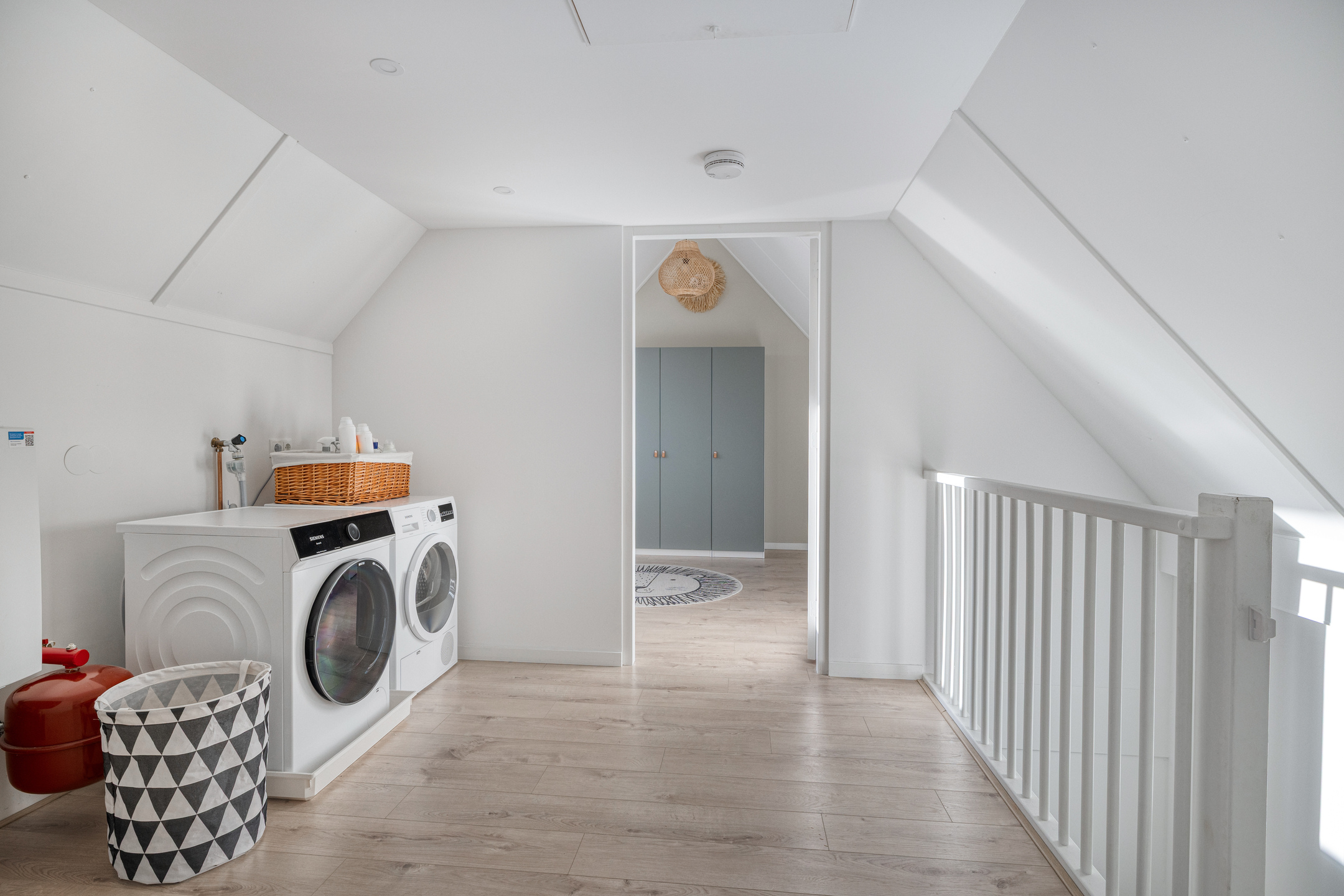 Via een vaste trap is de tweede verdieping bereikbaar. Je komt op de overloop waar onder andere de opstelplaats voor de wasmachine en droger zijn. Hier is ook de CV-combiketel (Atag 2018). Op de overloop is er een luik welke toegang geeft tot de vliering (3e verdieping) voor extra opbergruimte.