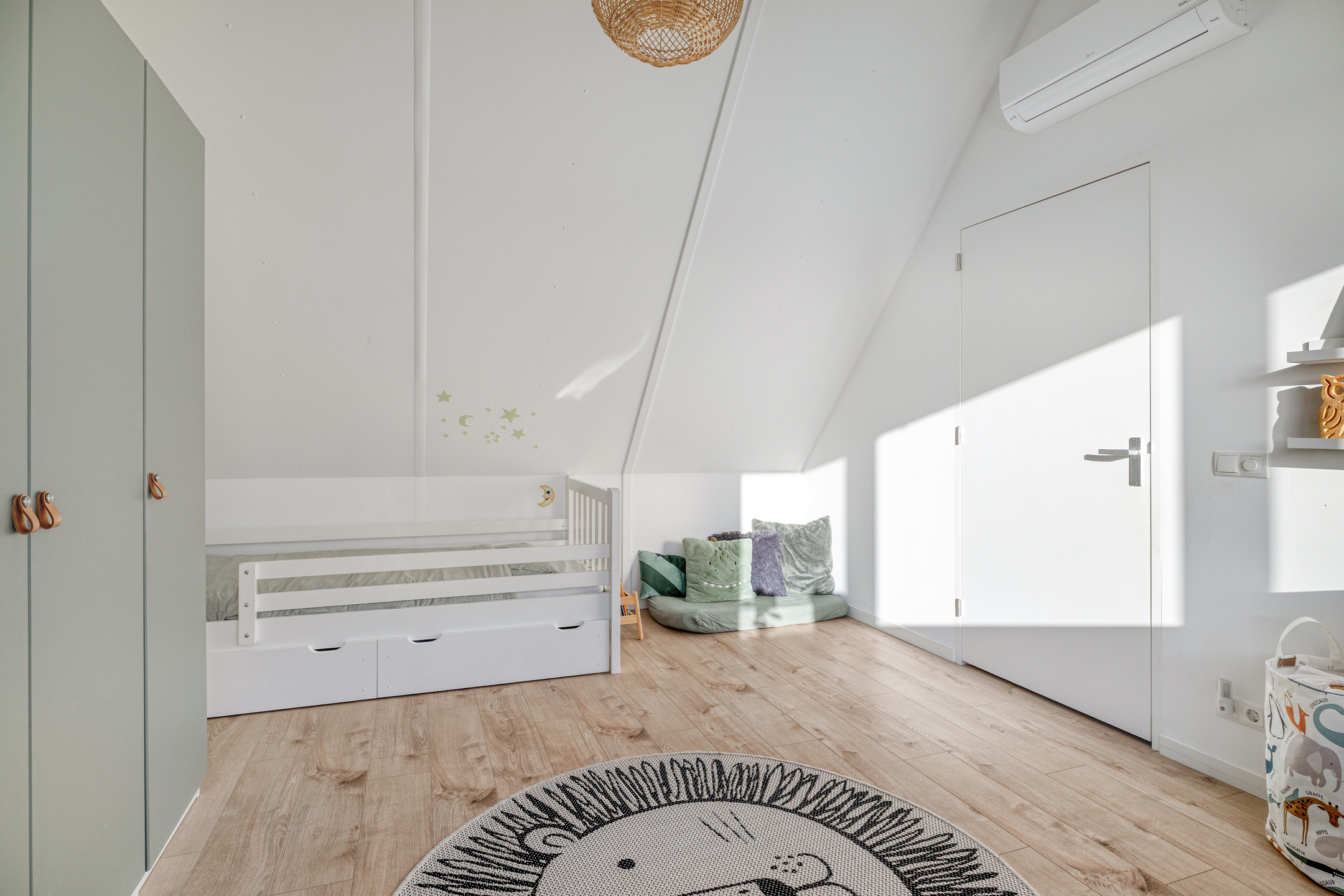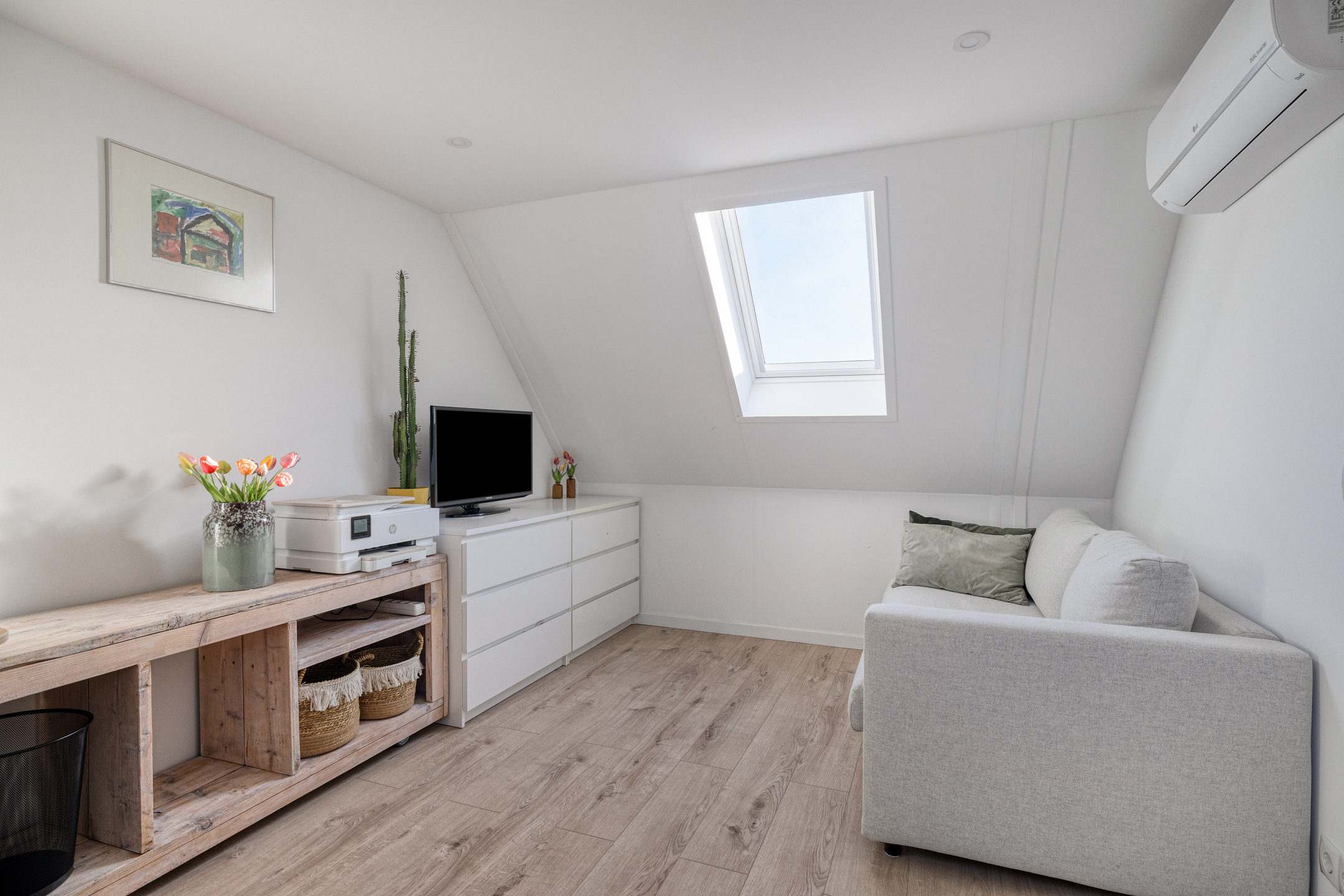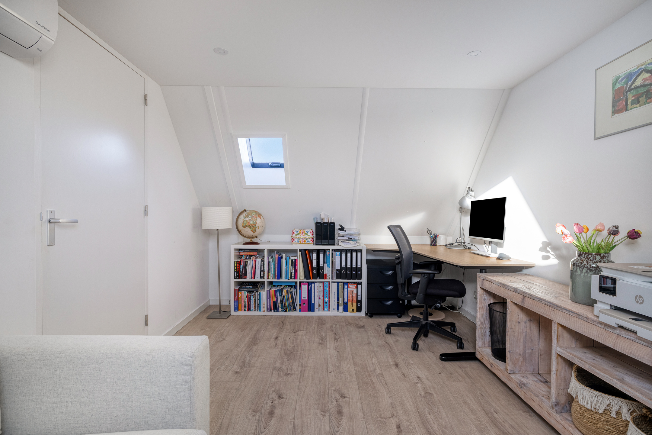 Aan de achterzijde is de vierde slaapkamer. De dakramen zorgen voor voldoende licht in de kamer. Ook deze kamer is voorzien van een airco.