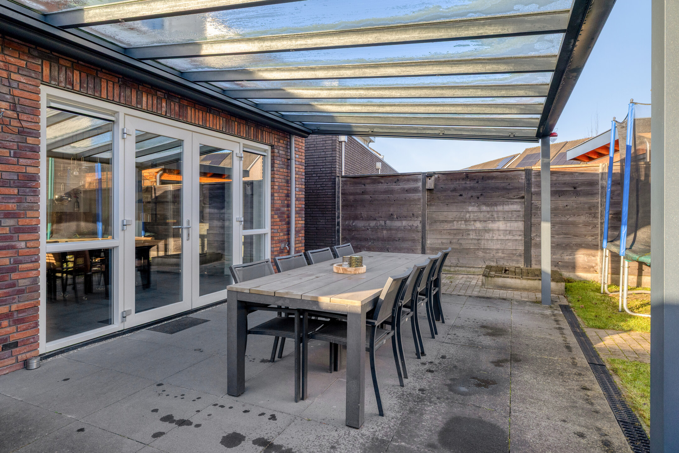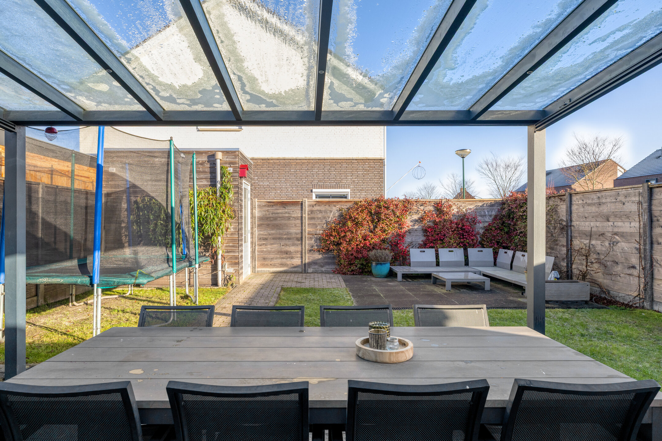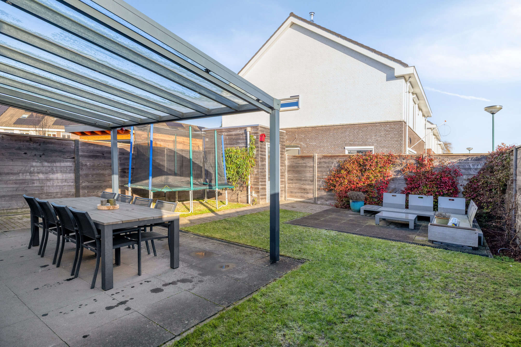 De achtertuin is volledig afgezet met een houten poort. Achter de woning is er een aluminium overkapping met helder glas welke voorzien is van een elektrisch screen. Het terras is voorzien van grote terrastegels. In de zomer een heerlijke plek om buiten te eten of met vrienden/familie te borrelen.