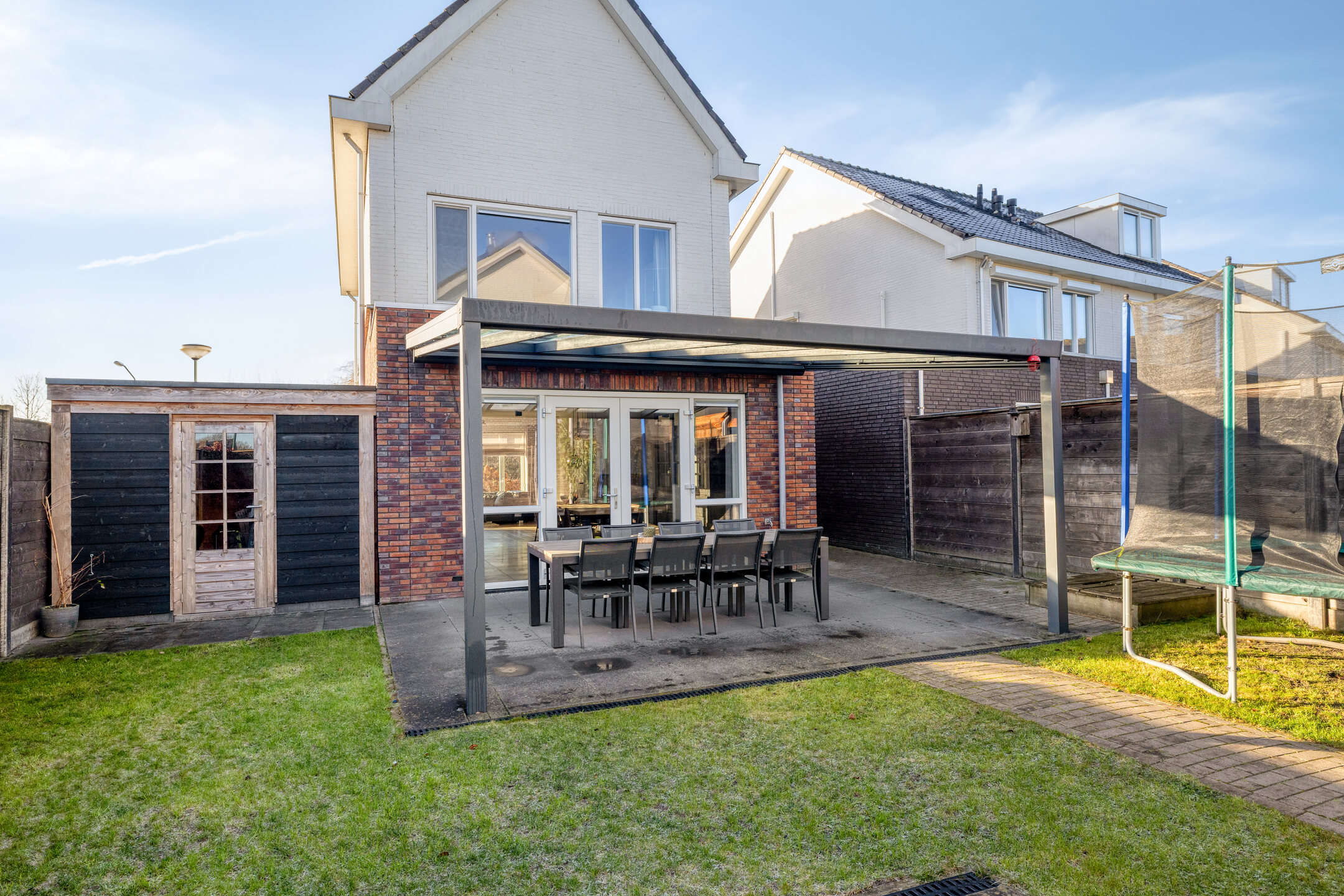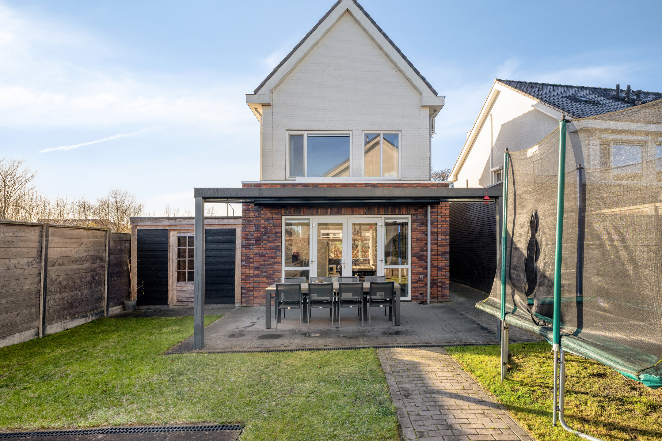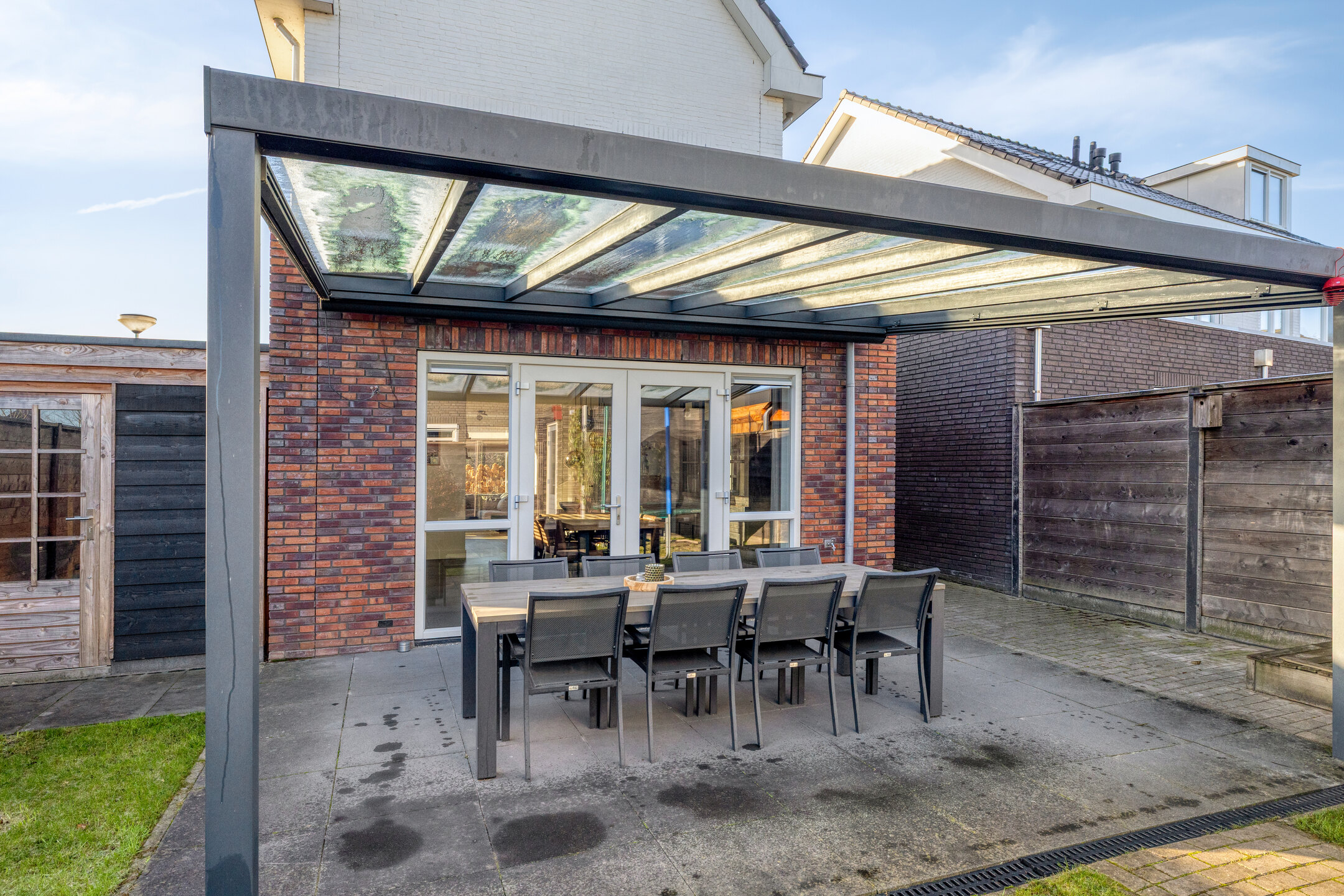 De achtertuin is volledig afgezet met een houten poort. Achter de woning is er een aluminium overkapping met helder glas welke voorzien is van een elektrisch screen. Het terras is voorzien van grote terrastegels. In de zomer een heerlijke plek om buiten te eten of met vrienden/familie te borrelen.