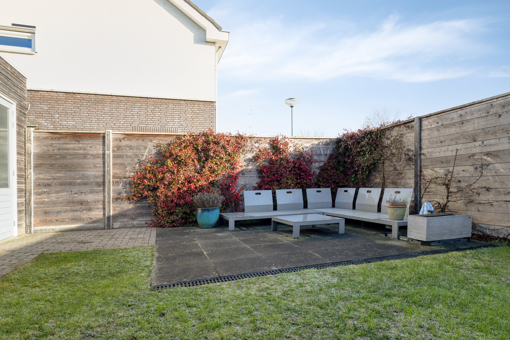 Achter in de tuin is er een tweede betegeld terras. Verder is de tuin voorzien van een gazon en enkele struiken tegen de houten schutting.