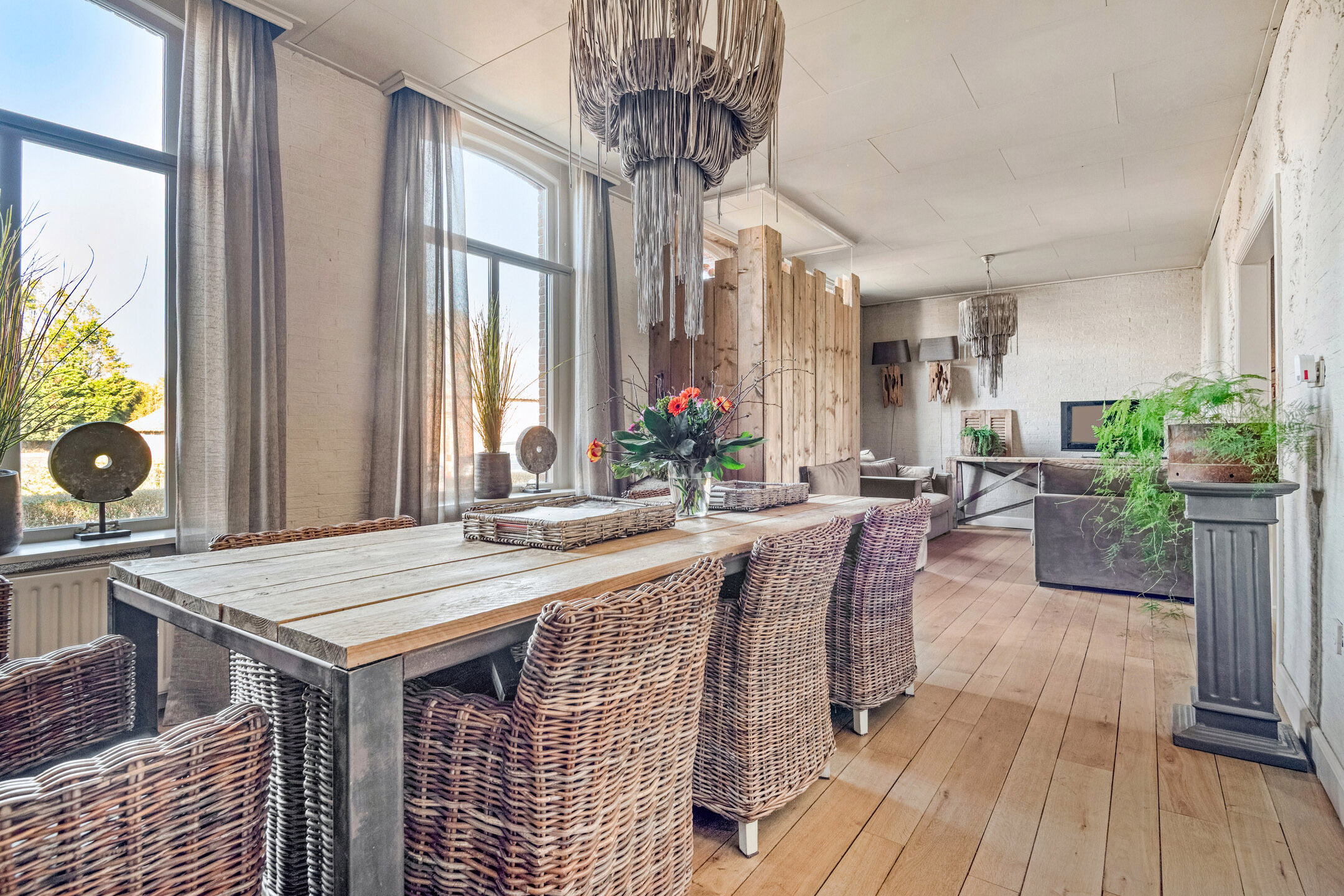 De woonkamer straalt warmte en sfeer uit en wordt gekenmerkt door de fraaie houten vloer, die bijdraagt aan het authentieke karakter van het huis.