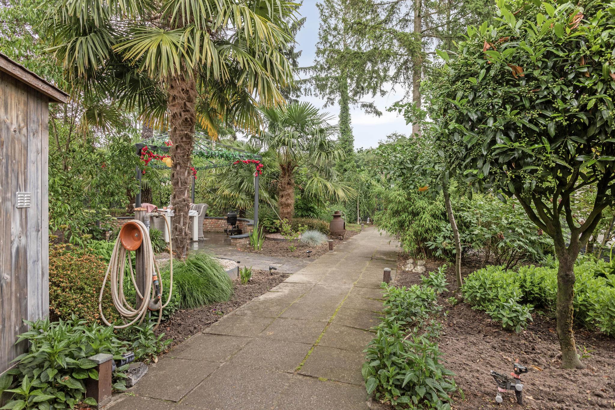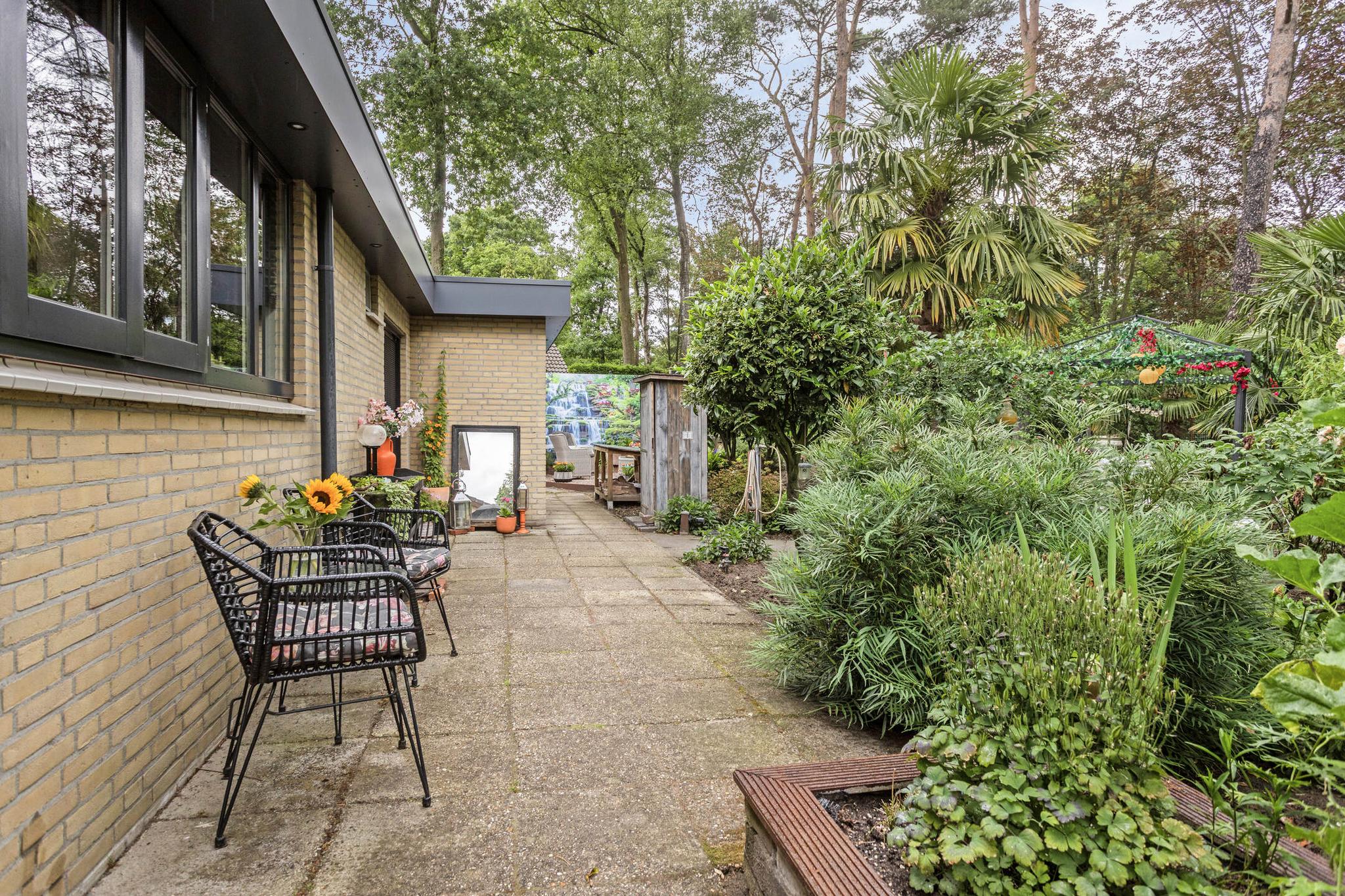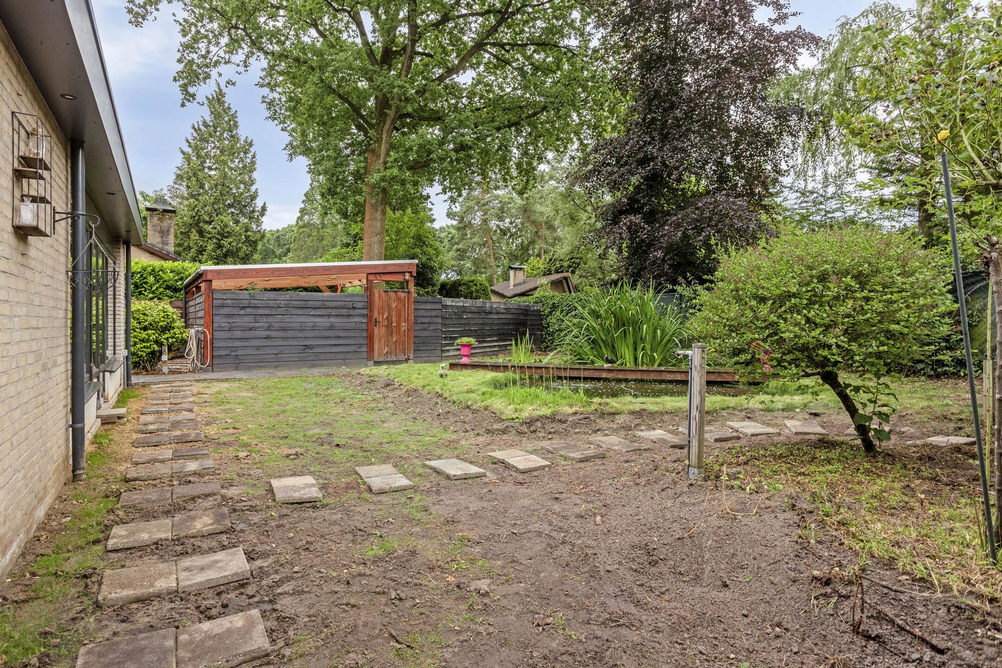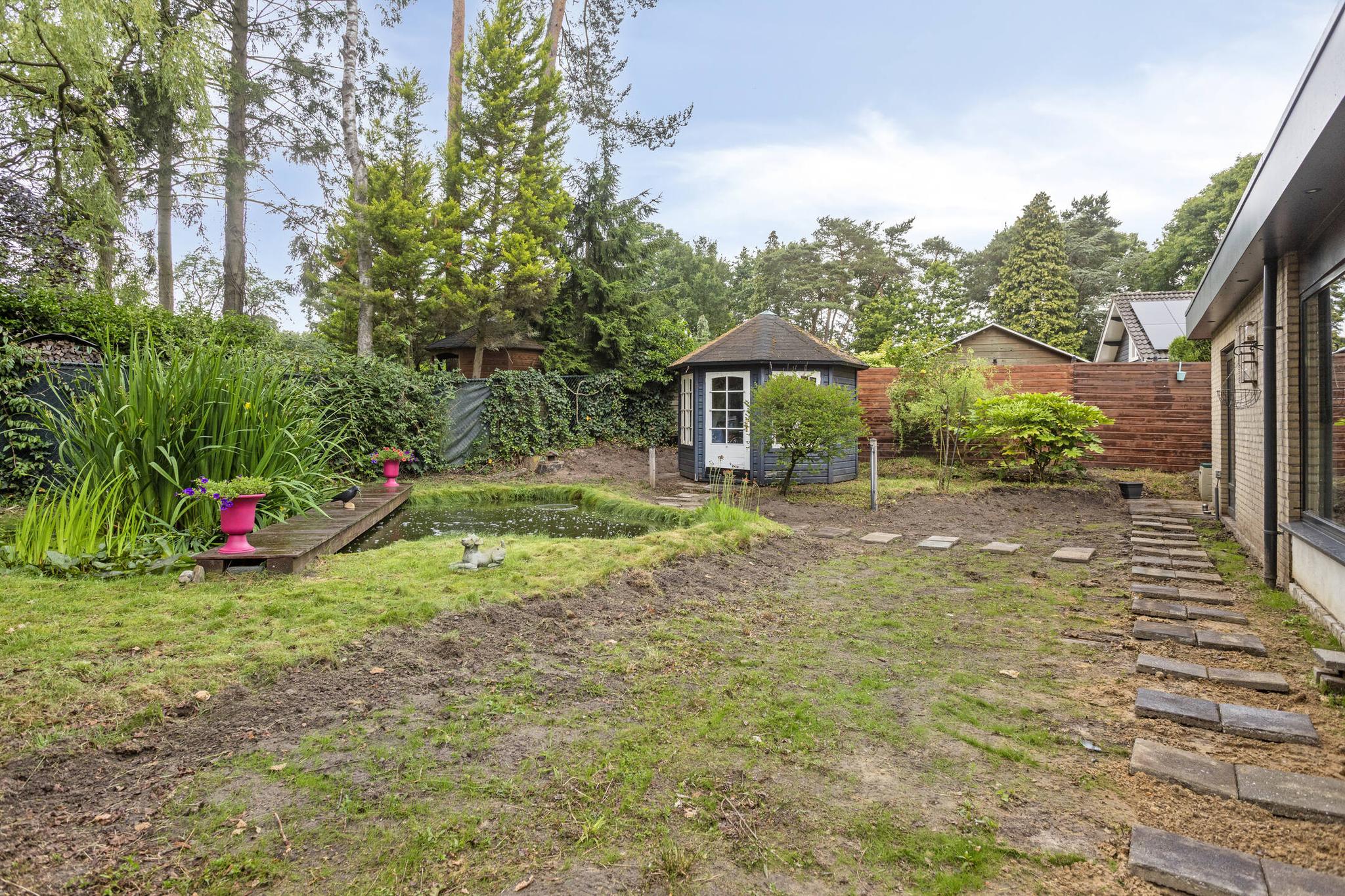 De riante tuin ligt rondom de woning en biedt volop privacy. Dankzij meerdere terrassen, een pergola, een vijver, sierbestrating en gevarieerde beplanting is het hier optimaal genieten van het buitenleven. De tuin is volledig omheind, waardoor rust en veiligheid gewaarborgd zijn. Er is een grondwaterpomp aanwezig met meerdere waterpunten, ideaal voor het beregenen van de tuin.