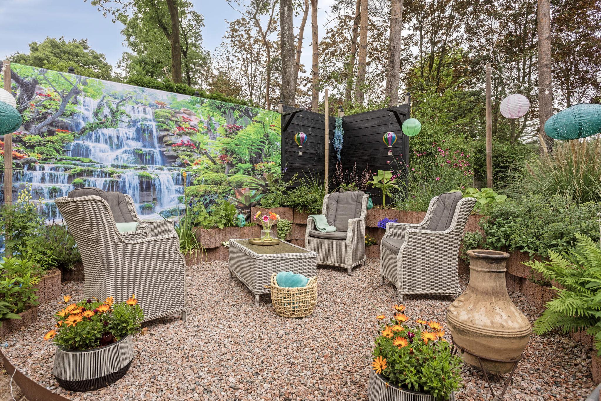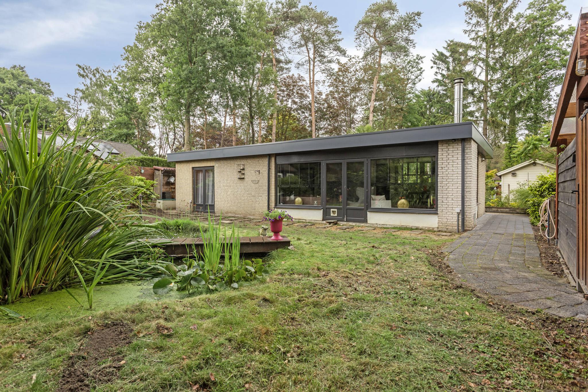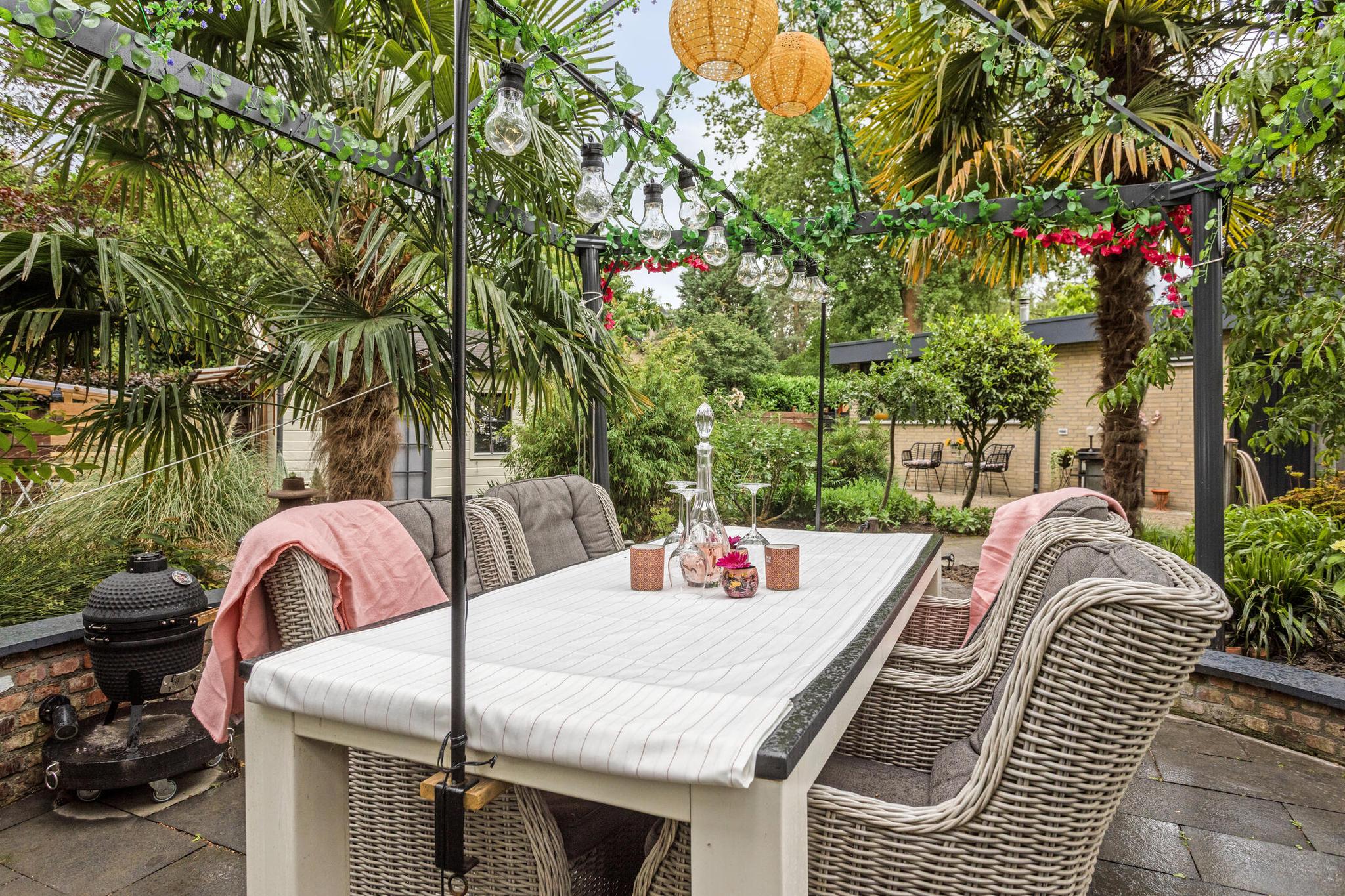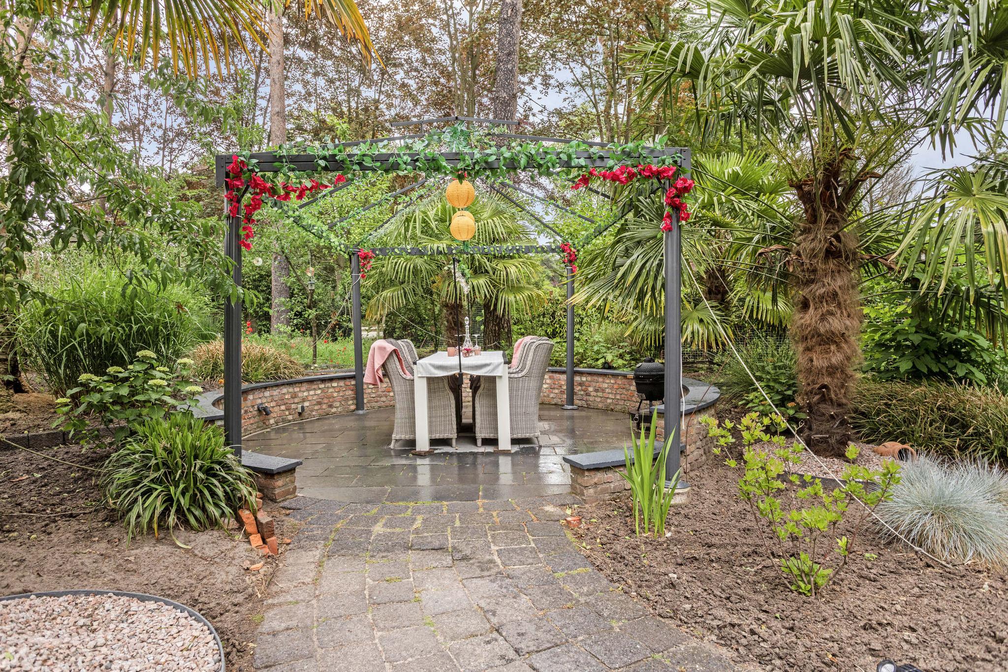 De riante tuin ligt rondom de woning en biedt volop privacy. Dankzij meerdere terrassen, een pergola, een vijver, sierbestrating en gevarieerde beplanting is het hier optimaal genieten van het buitenleven. De tuin is volledig omheind, waardoor rust en veiligheid gewaarborgd zijn. Er is een grondwaterpomp aanwezig met meerdere waterpunten, ideaal voor het beregenen van de tuin.