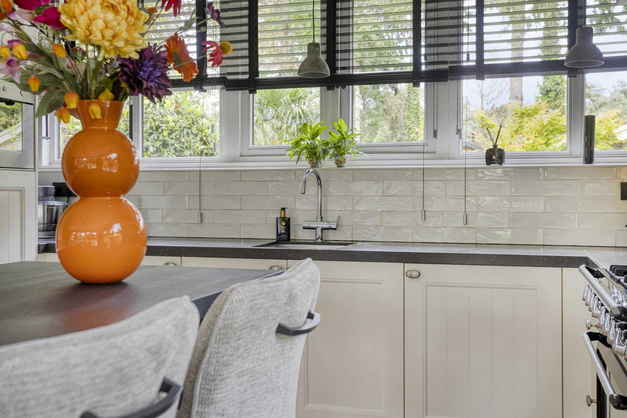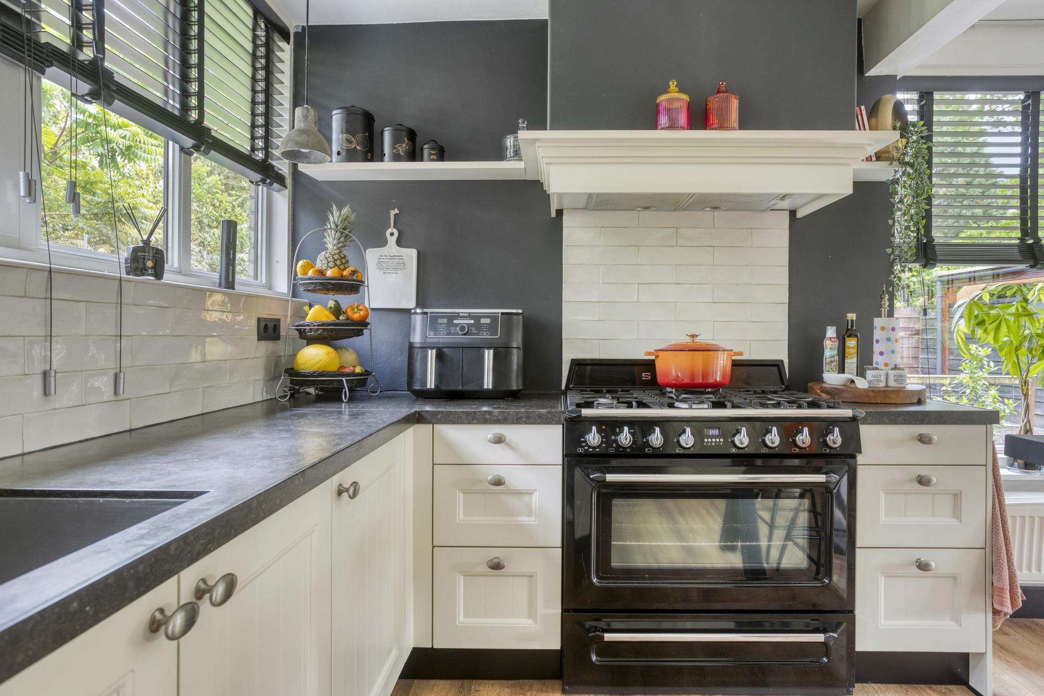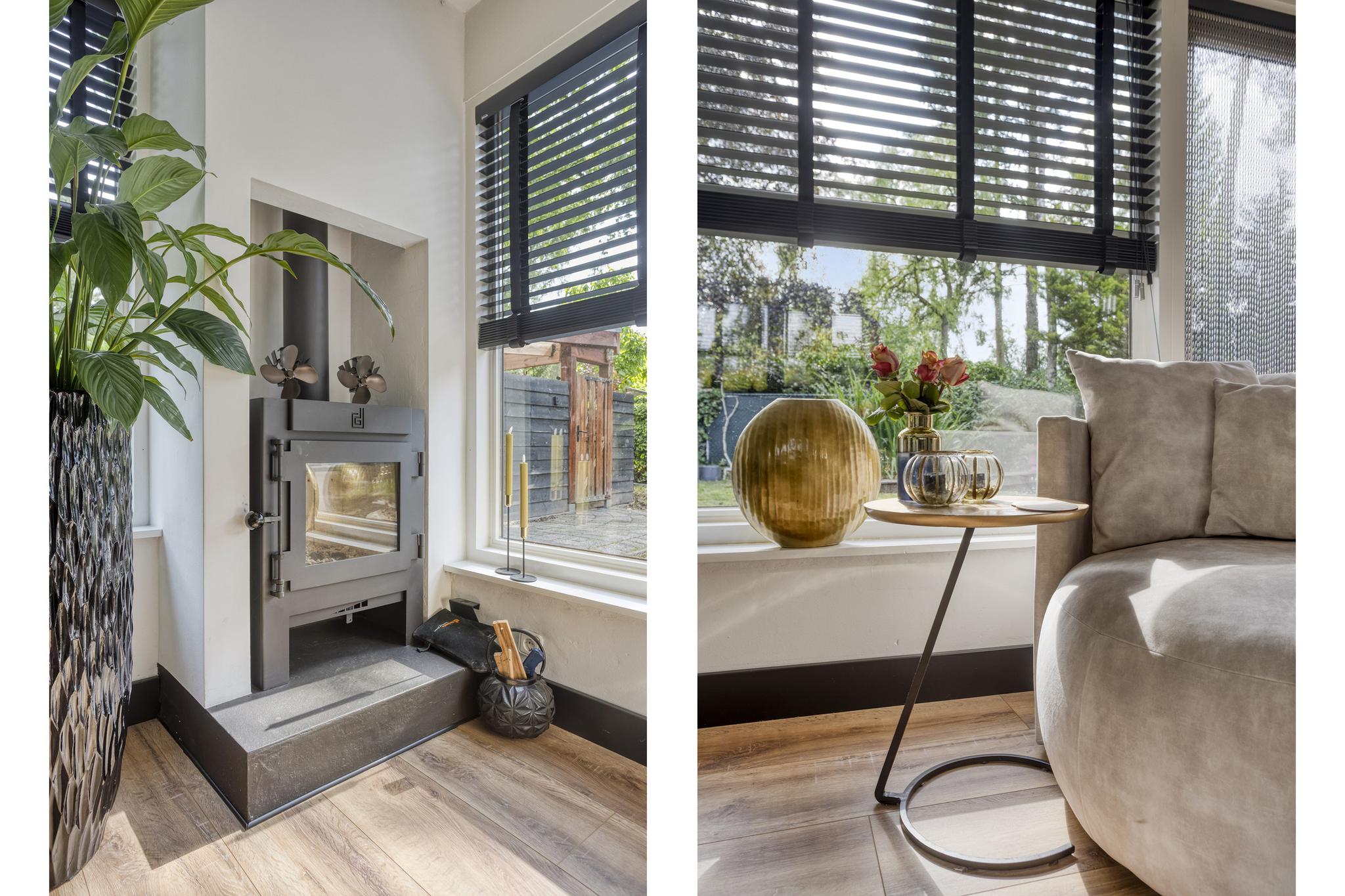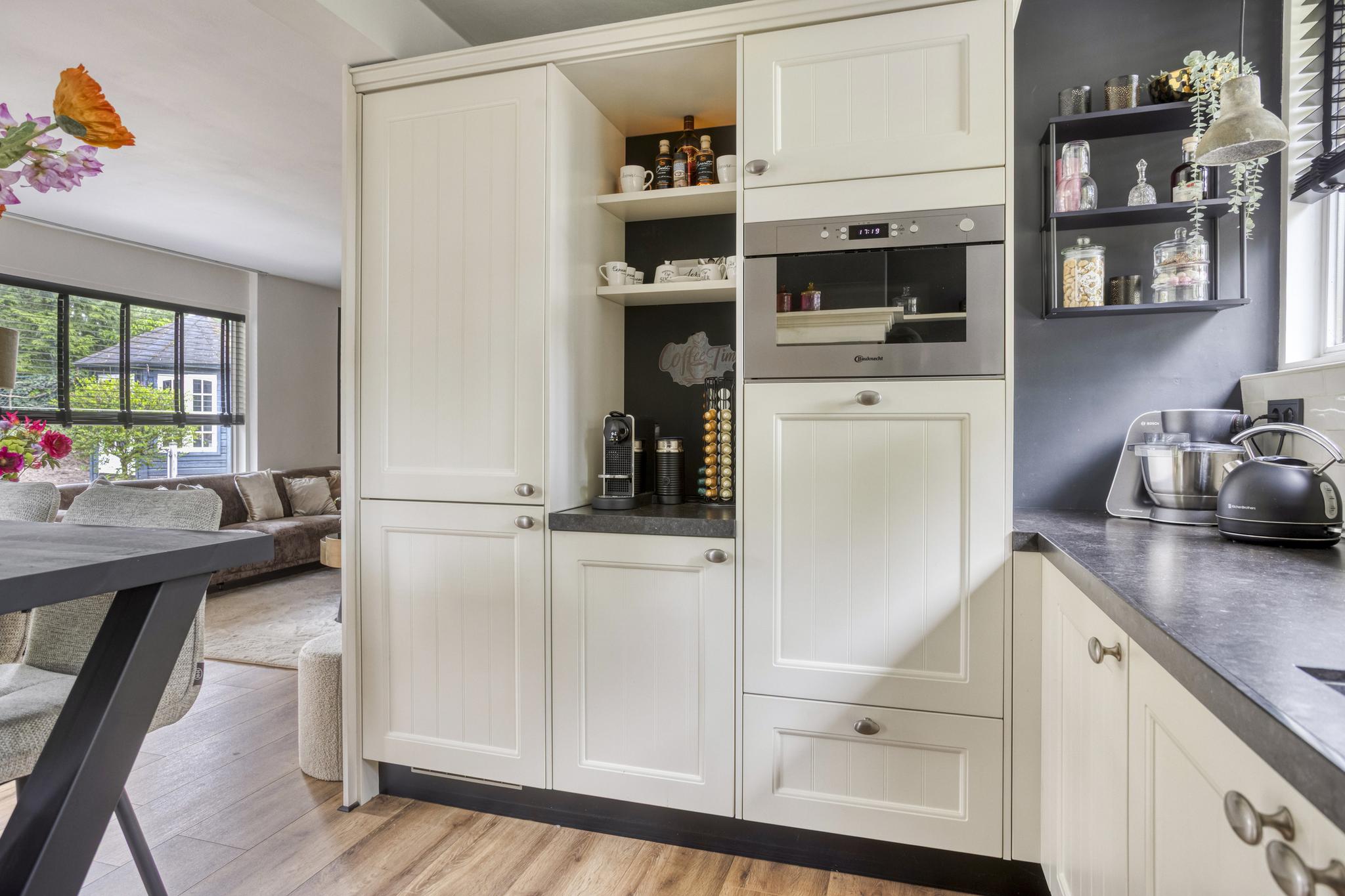 De woonkamer is een fijne leefruimte met veel lichtinval dankzij grote raampartijen en openslaande deuren naar de tuin. De houtkachel zorgt voor extra sfeer en warmte, en de gezellige leeshoek maakt het plaatje compleet. De open keuken in U-opstelling is voorzien van een granieten werkblad (toplaag), een vaatwasser op hoogte, een koel-/vriescombinatie, een magnetron, een r.v.s. spoelbak, een close-in boiler, een 5-pits gasfornuis met oven (Smeg) en een afzuigkap. Ideaal voor wie graag kookt.
