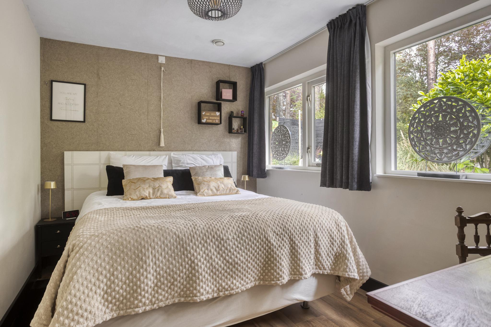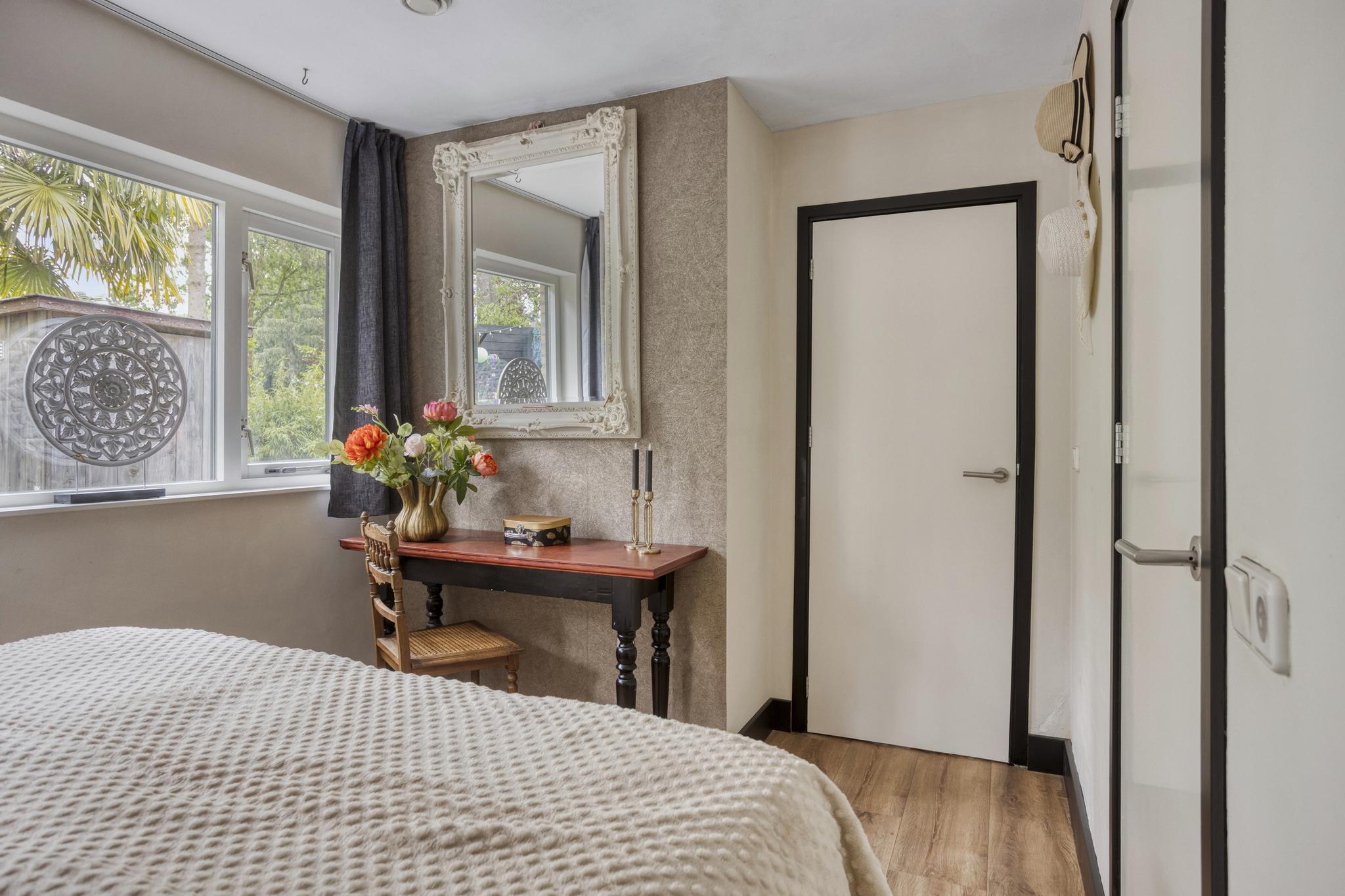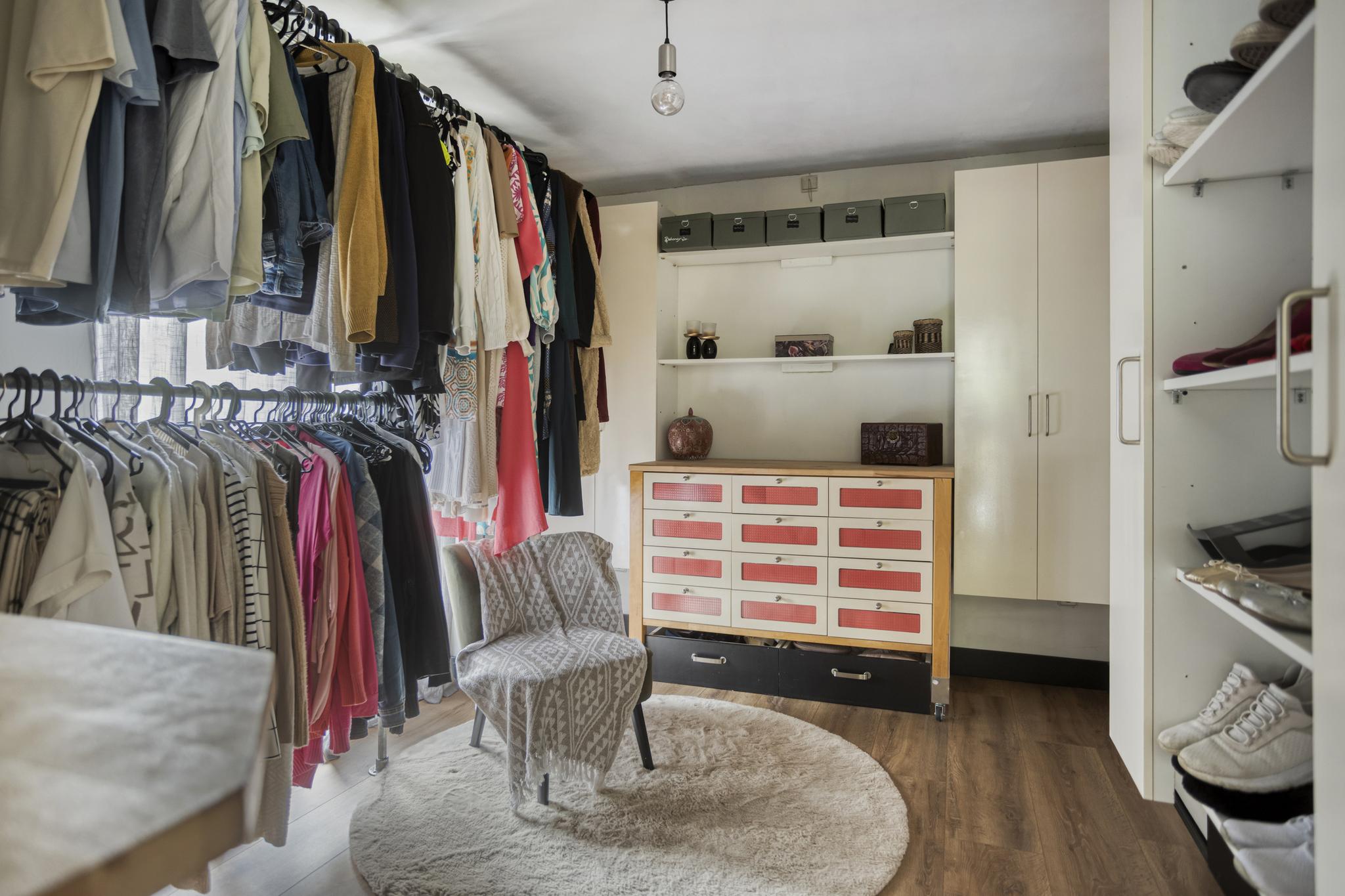 Aansluitend aan de woonkamer bevindt zich een tweede slaapkamer, momenteel ingericht als kledingkamer, met ook hier openslaande deuren naar de tuin.