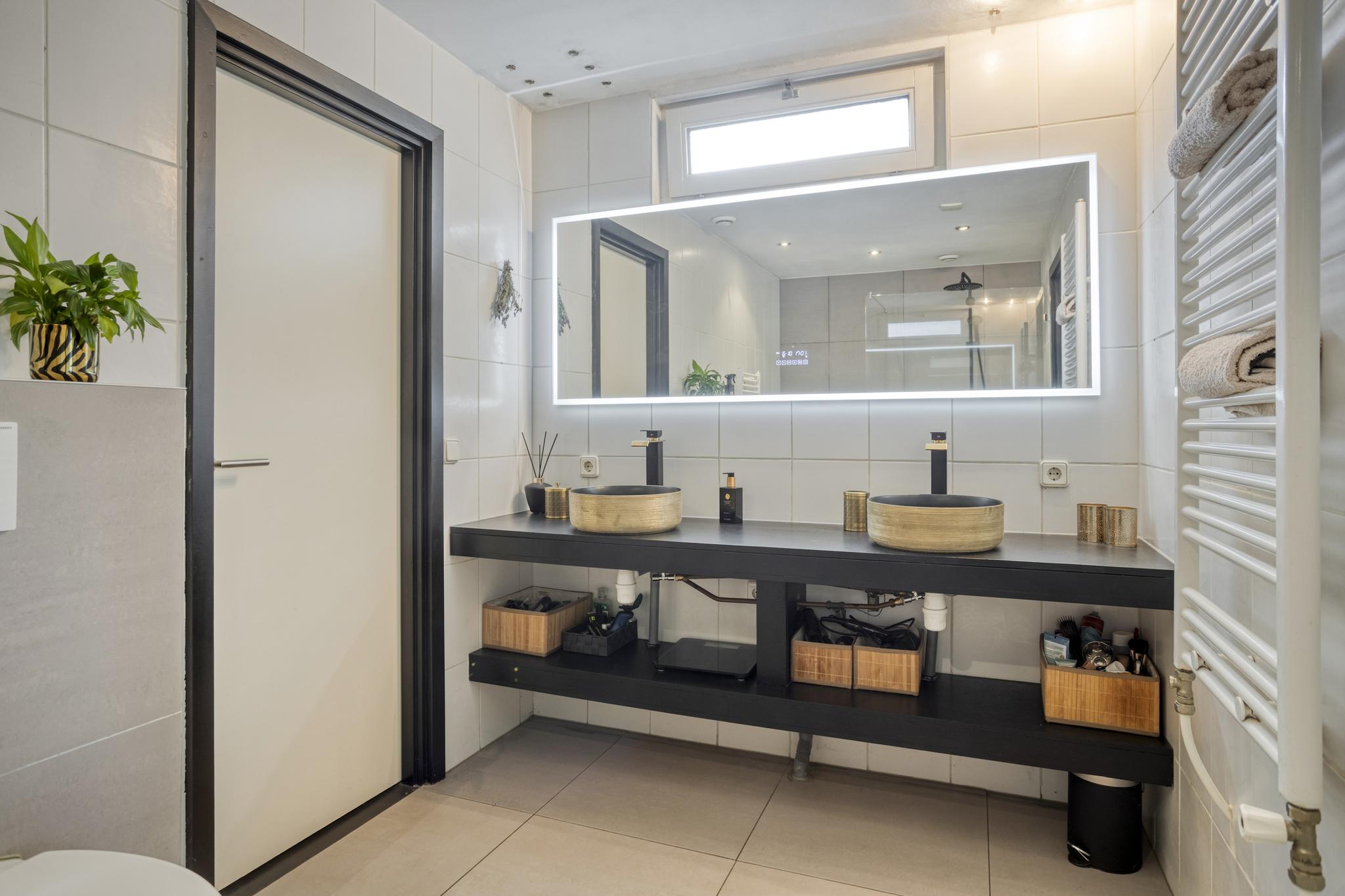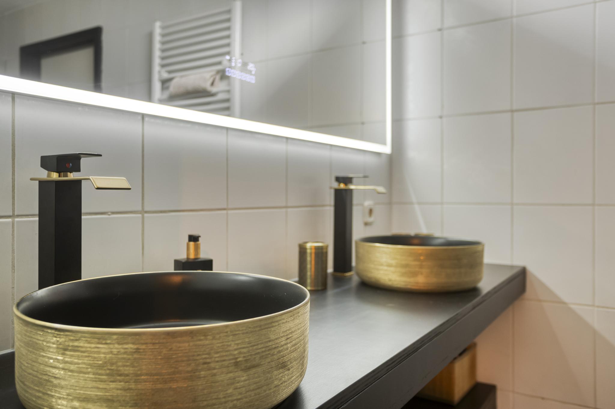 Beide slaapkamers hebben toegang tot de moderne badkamer, die voorzien is van elektrische vloerverwarming, twee handdoekradiatoren, een inloopdouche met regen- en handdouche, een tweede toilet en een stijlvol badmeubel met dubbele waskommen.