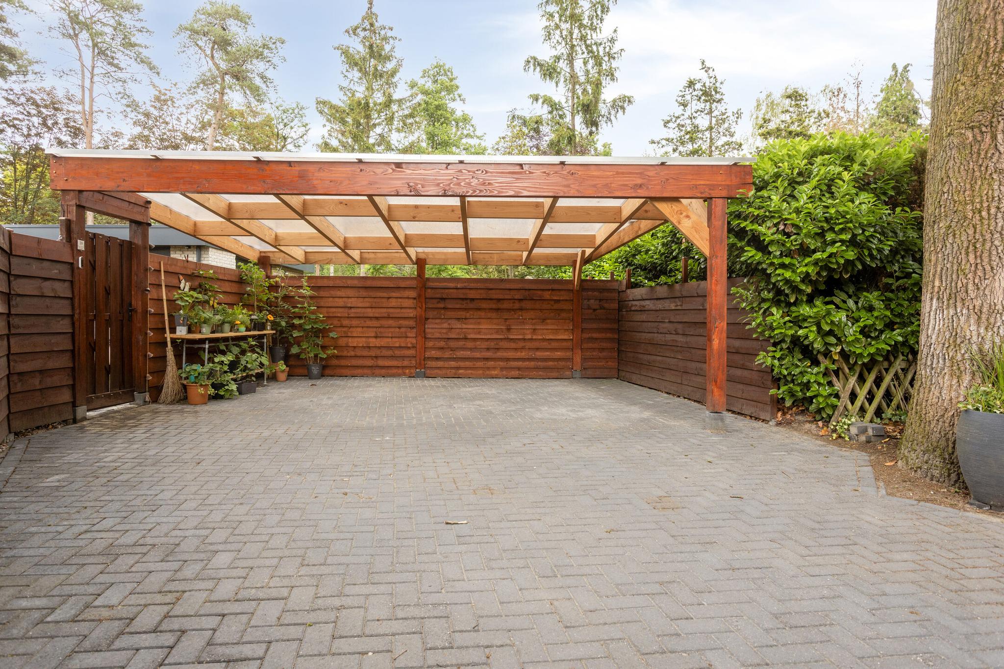 Op eigen terrein is ruime parkeergelegenheid onder een grote carport. Daarnaast zijn er twee houten bergingen met elektra; één hiervan is voorzien van een geïsoleerd dak.