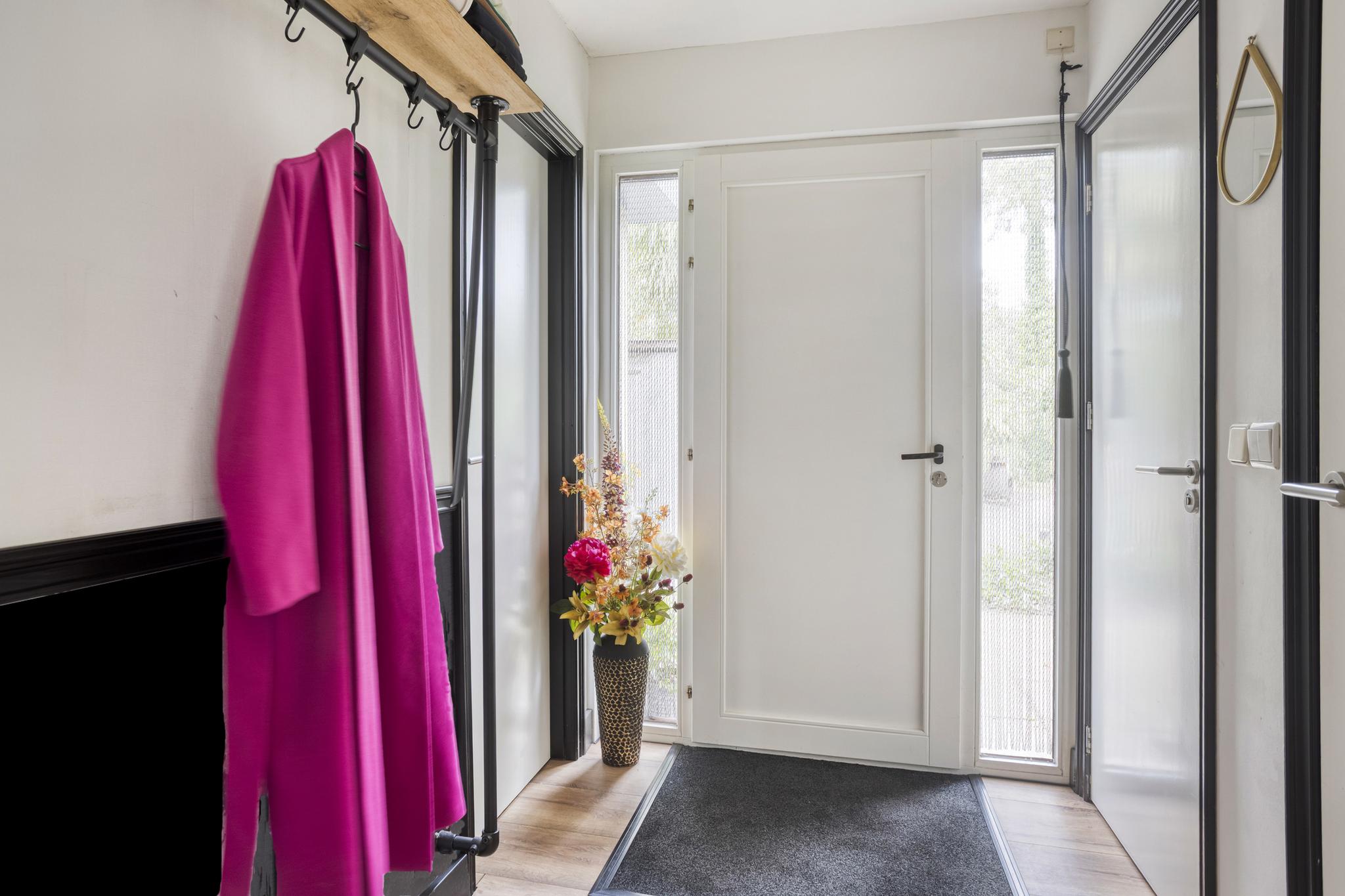 Via de entree kom je in de hal, die toegang biedt tot de toiletruimte met wandcloset, een praktische was-/bergruimte met de opstelplaats van de c.v.-combiketel (Intergas, 2017), de aansluitingen voor de was- en droogapparatuur én de meterkast. Vanuit de hal bereik je de lichte woonkamer met open keuken en de hoofdslaapkamer.