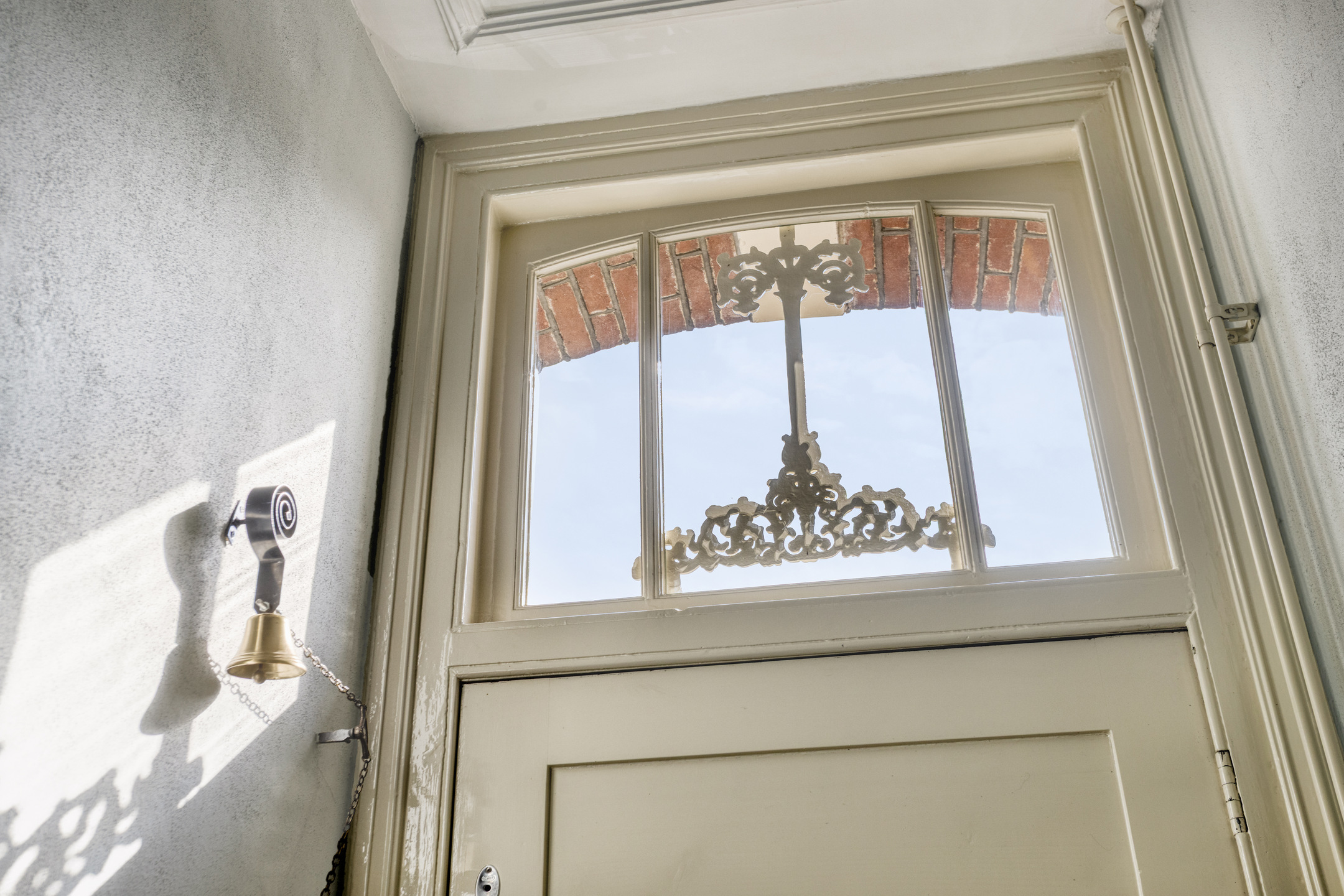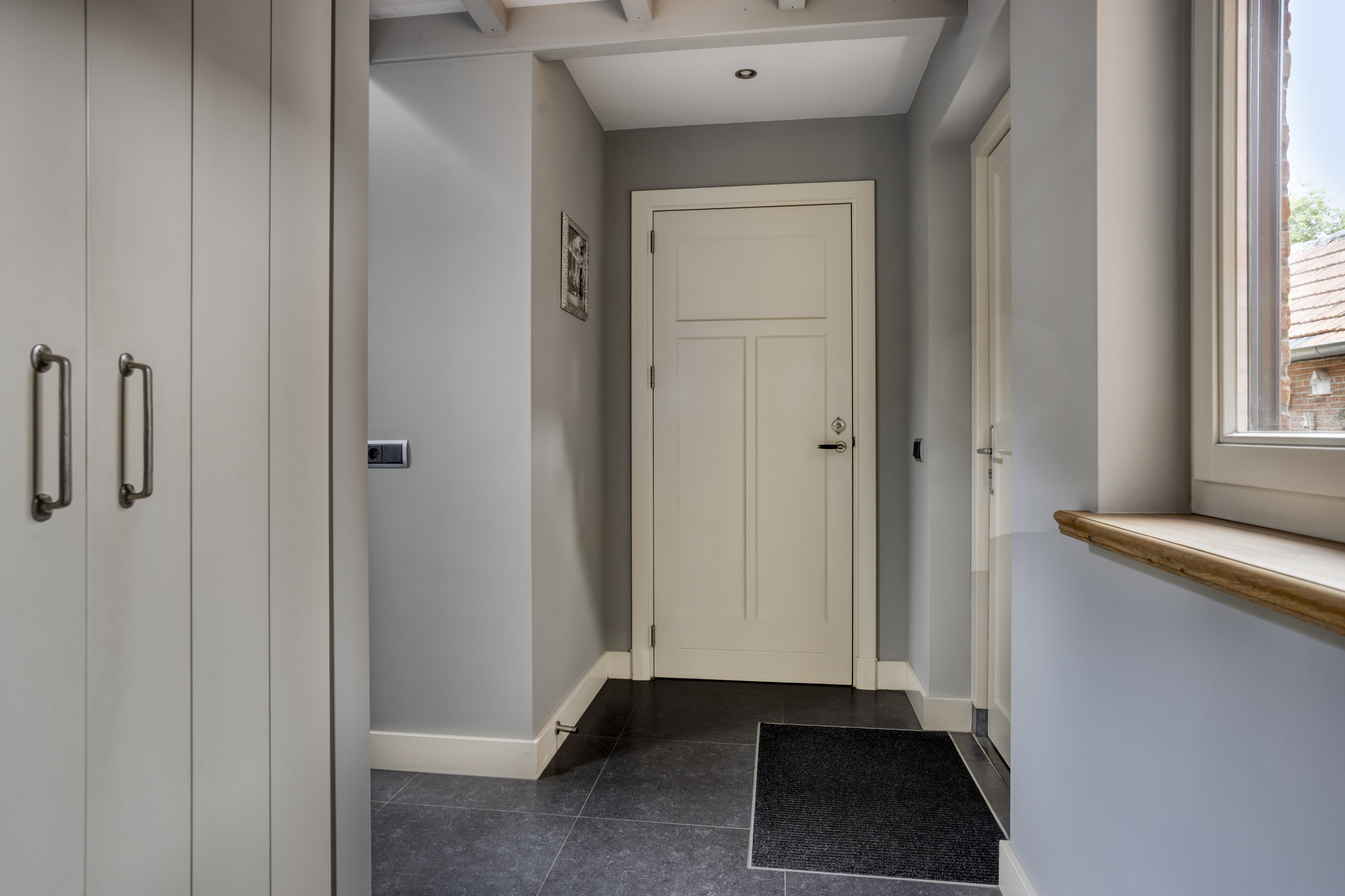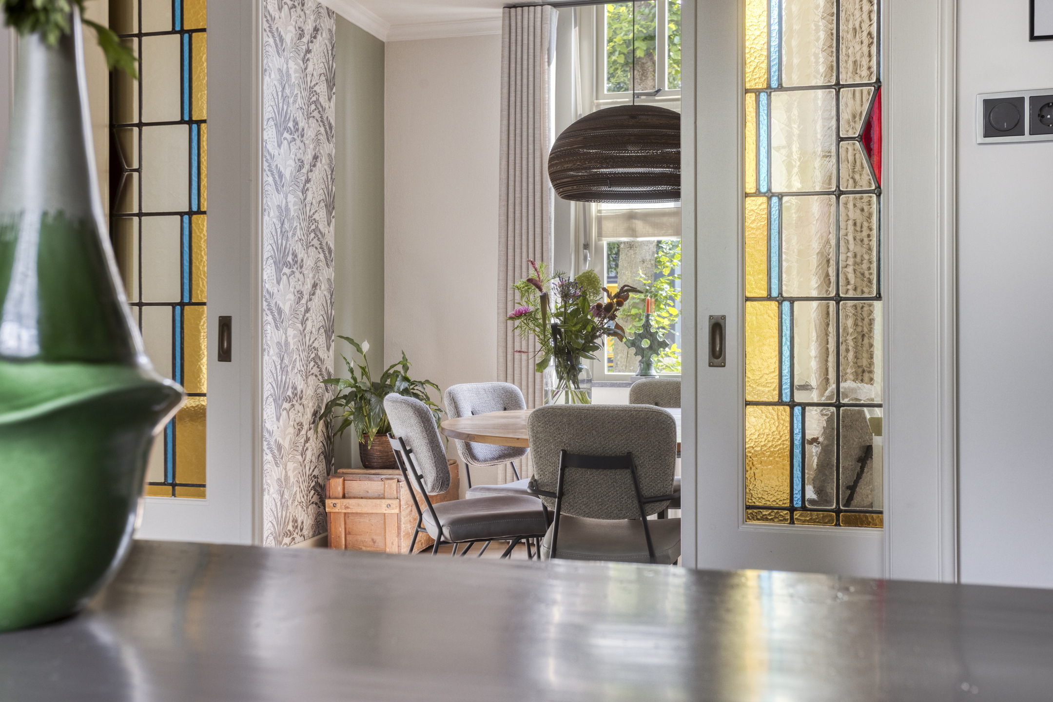 De voordeur is in het midden van de woning gesitueerd, wat bij dit type woningen uit die tijd past. Links en rechts van de centrale hal zijn twee kamers. De hal heeft een originele tegelvloer en de wanden zijn tot een hoogte van ca. 1.10 m voorzien van tegels. Boven de voordeur is de originele levensboom in het bovenlicht nog aanwezig. Dit zijn de leuke details die het karakter van de woning onderstrepen. Vanuit de hal kun je naar de eetkamer en naar de keuken.