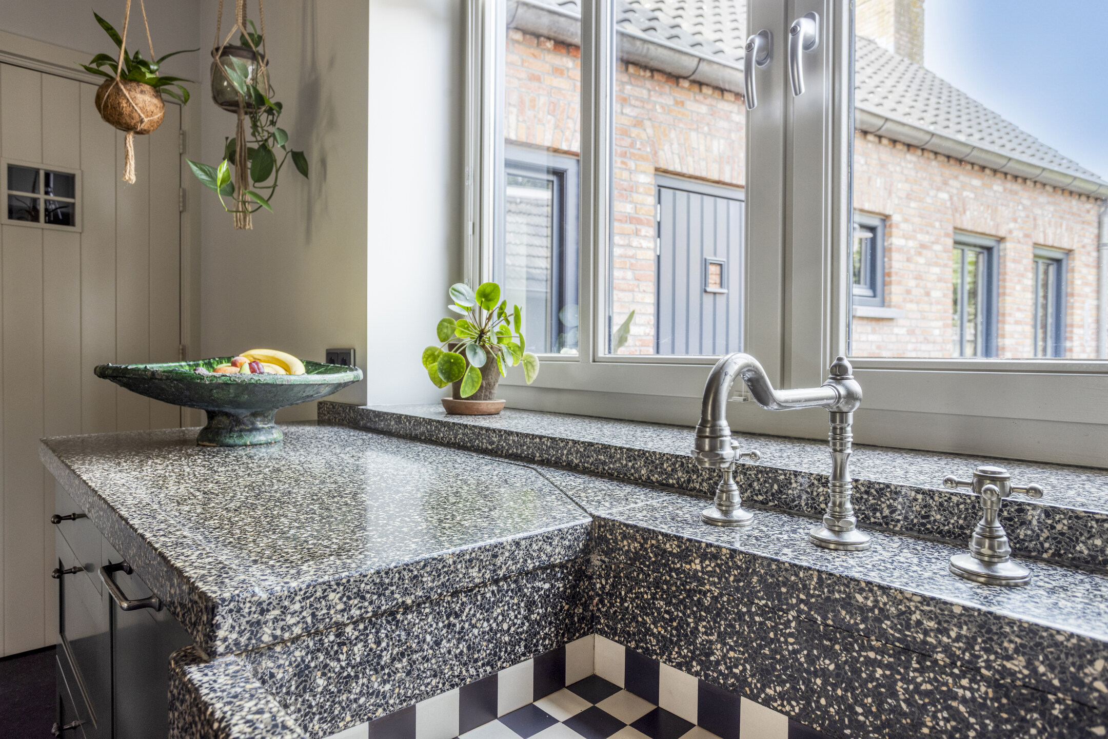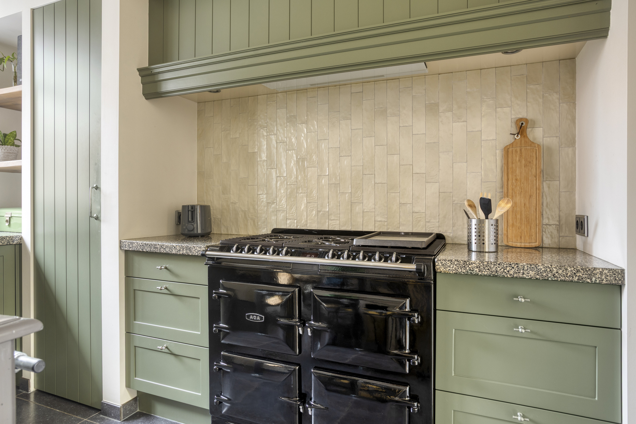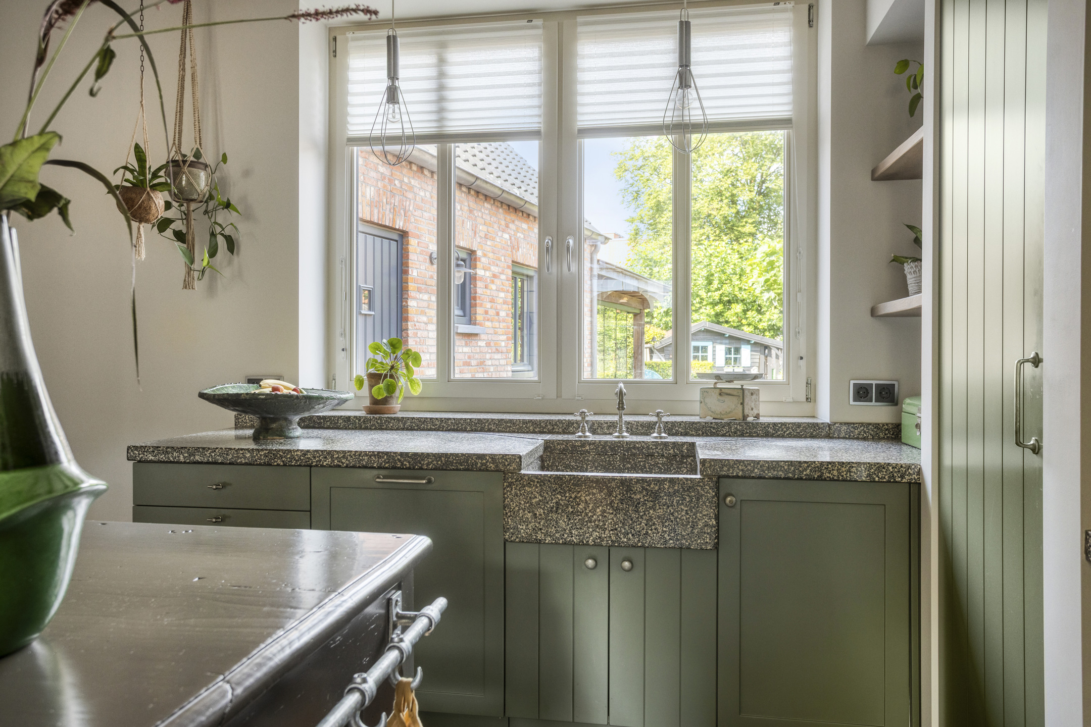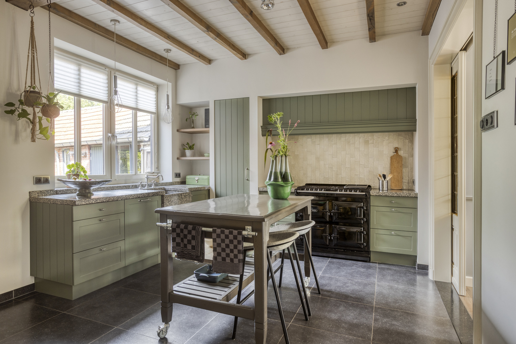 De ruime leefkeuken is aan de achterzijde van de woning gelegen. De keukenopstelling past bij de sfeer van de woning. Naast de diverse kastjes en lades is er een granieten werkblad. Hierin is de gootsteen verwerkt. Er is een fornuis met 6 gaspitten en een dubbele oven aanwezig. Verder is de keuken voorzien van een koelkast en vaatwasser. De keuken heeft een landelijke uitstraling. Er is een tegelvloer welke voorzien is van vloerverwarming. In de keuken is ook de entree naar de kelder. De kelderwanden zijn volledig betegeld. Via de dubbele ensuite deuren ga je naar de eetkamer.