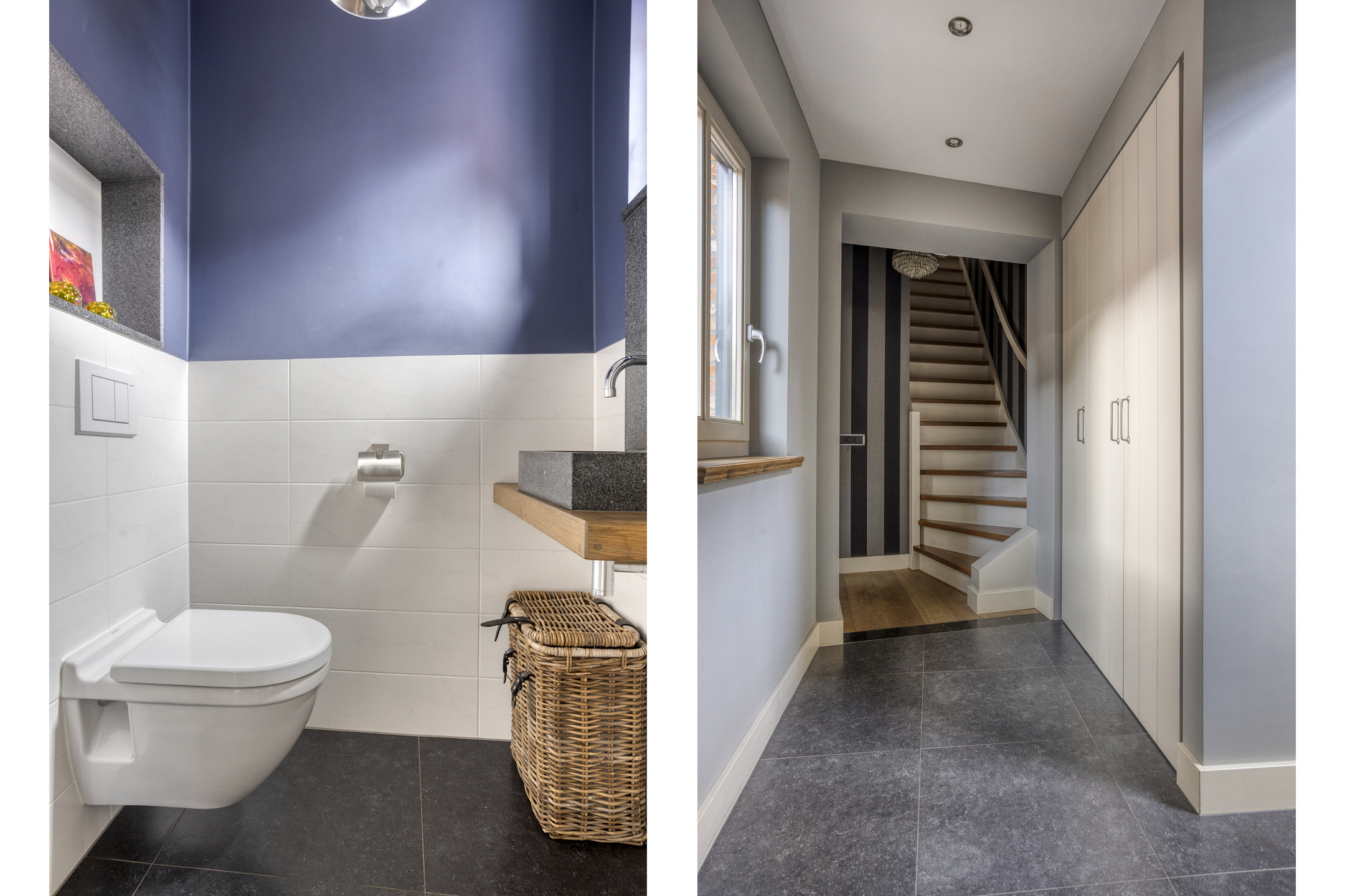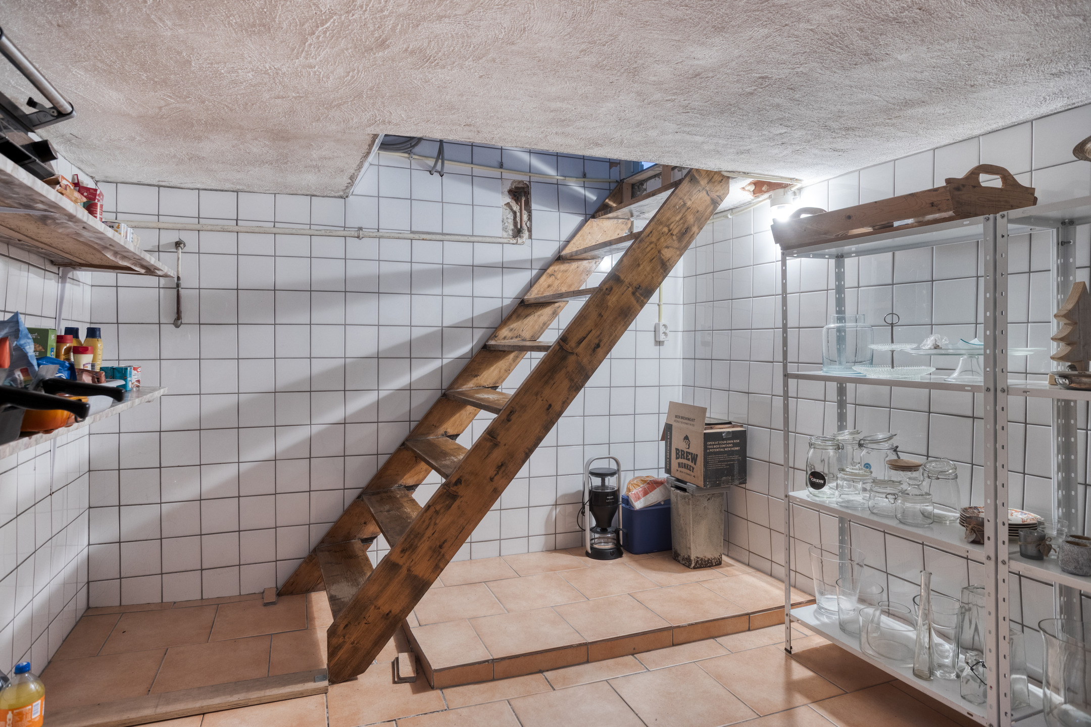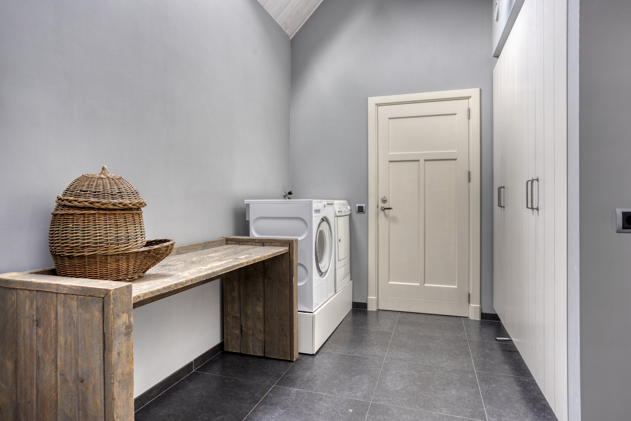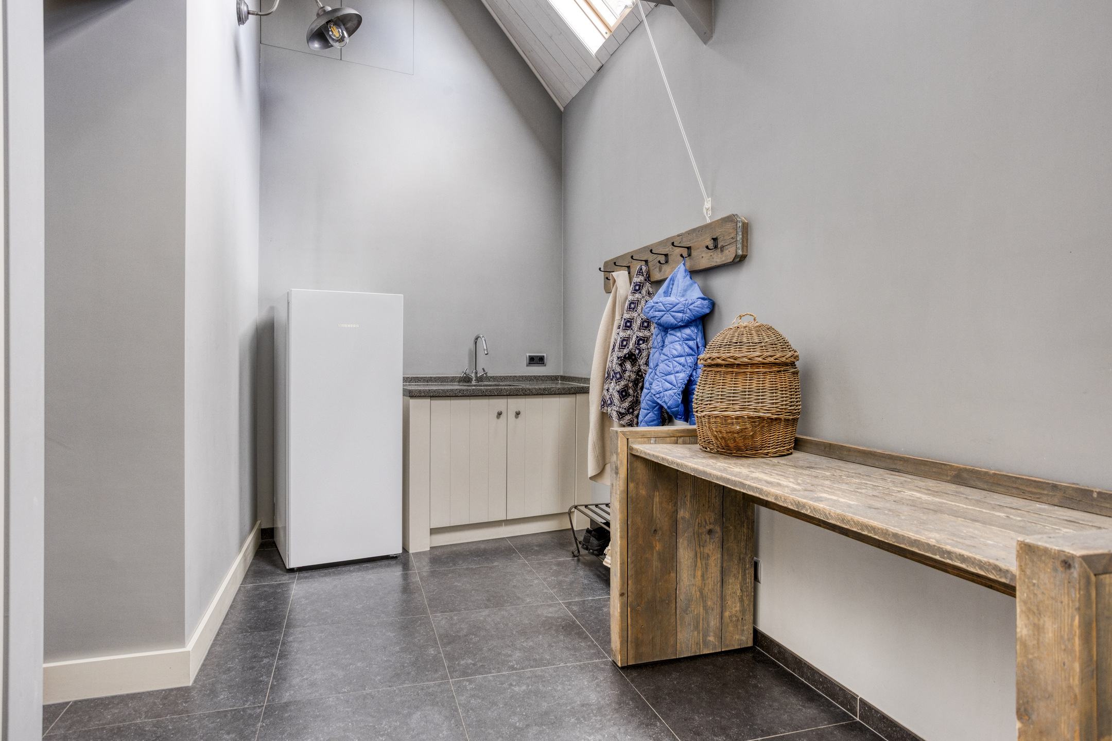 Vanuit de keuken kom je in een tussenhal. Hier is de vaste trap naar de 1e verdieping als ook de toegang tot de bijkeuken. Deze later verbouwd/aangebouwd. De tegelvloer is ook hier voorzien van vloerverwarming. Er zijn diverse inbouwkasten. In de bijkeuken is ook het toilet gelegen. Het is een zwevend closet en er is een fonteintje aanwezig. In het achterste deel van de bijkeuken is de opstelplaats voor de wasmachines en droger. Er is een keukenblok met spoelbak met koud en warmwater aanwezig. In dit deel zijn ook inbouwkasten voor extra opbergruimte.