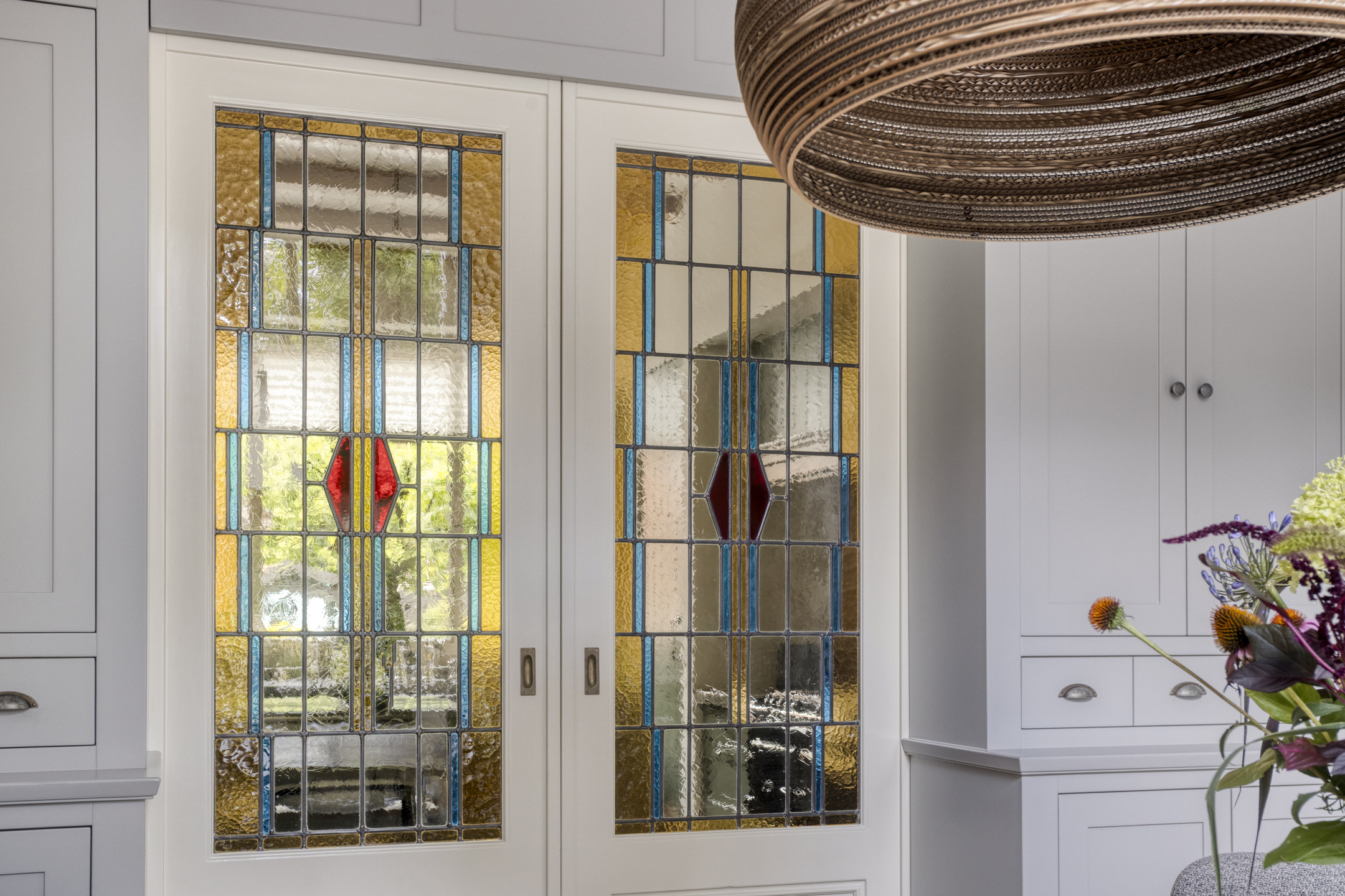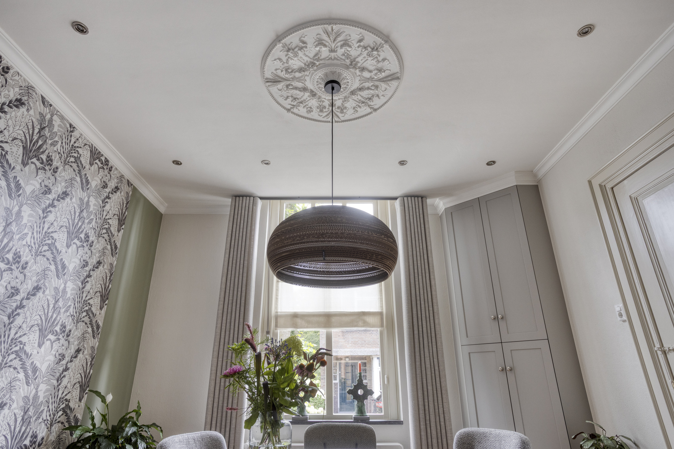 De ensuite deuren zijn voorzien van glas in lood. Er is een houtenvloer en de wanden en plafond zijn gestuct. Naast de ensuite deuren zijn kasten. In de hoek is er een inbouwkast, waar ook de meterkast is opgesteld. De eetkamer is ook via de hal te bereiken.