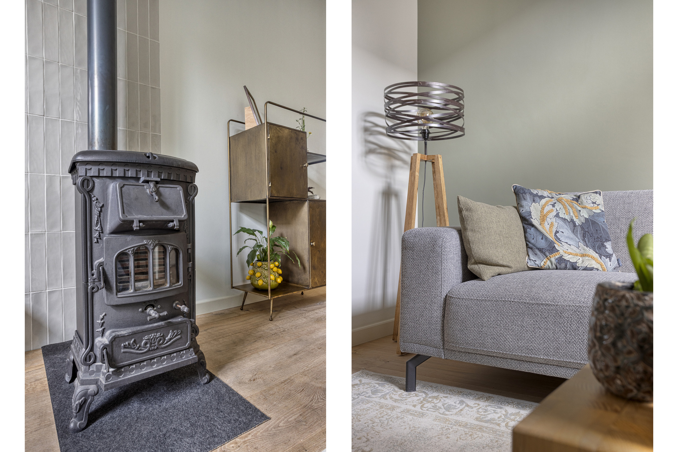 Via de keuken is de zitkamer te bereiken. Ook hier is het plafond en zijn de wanden gestuct. Centraal is de houtkachel opgesteld.