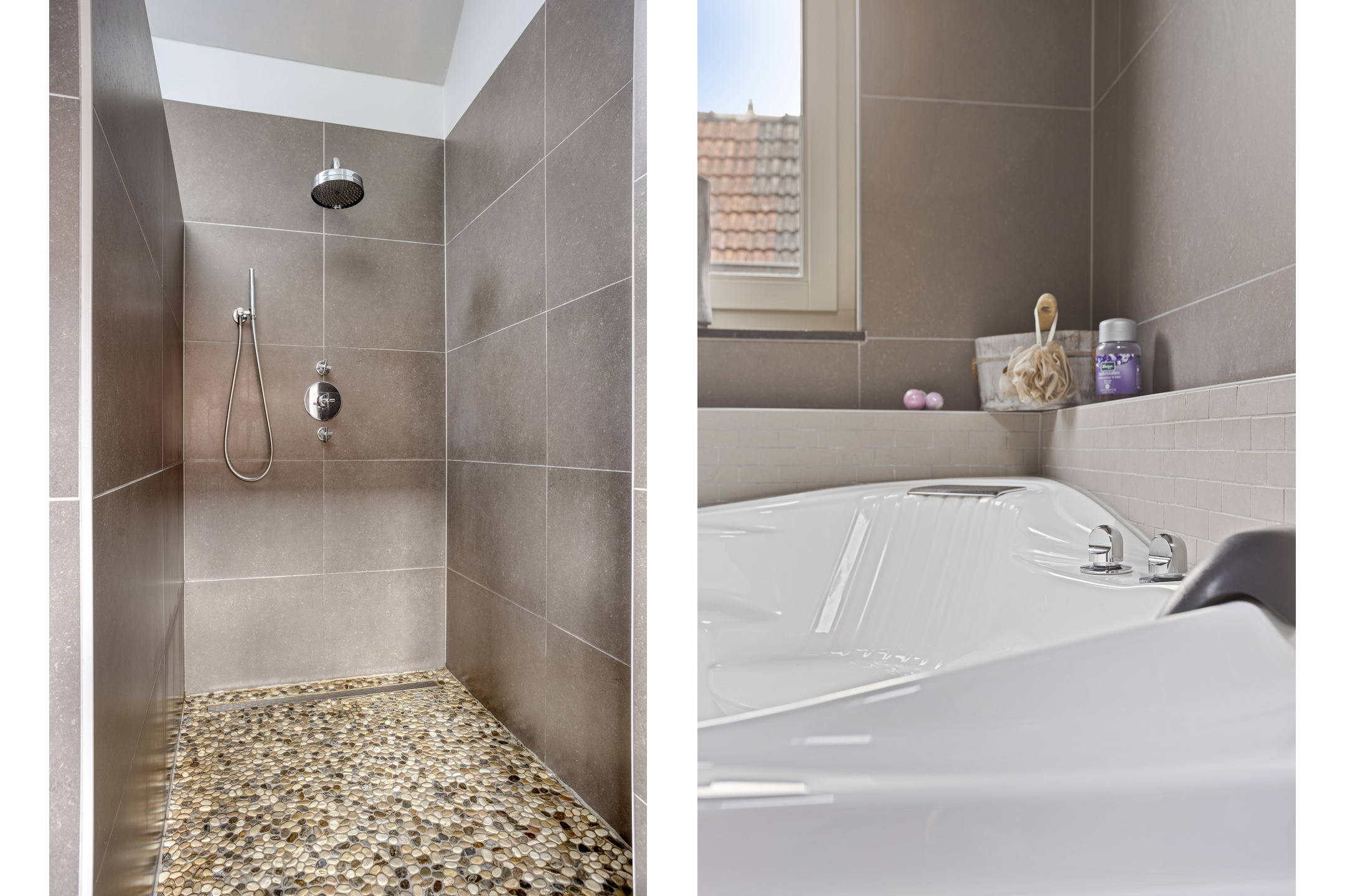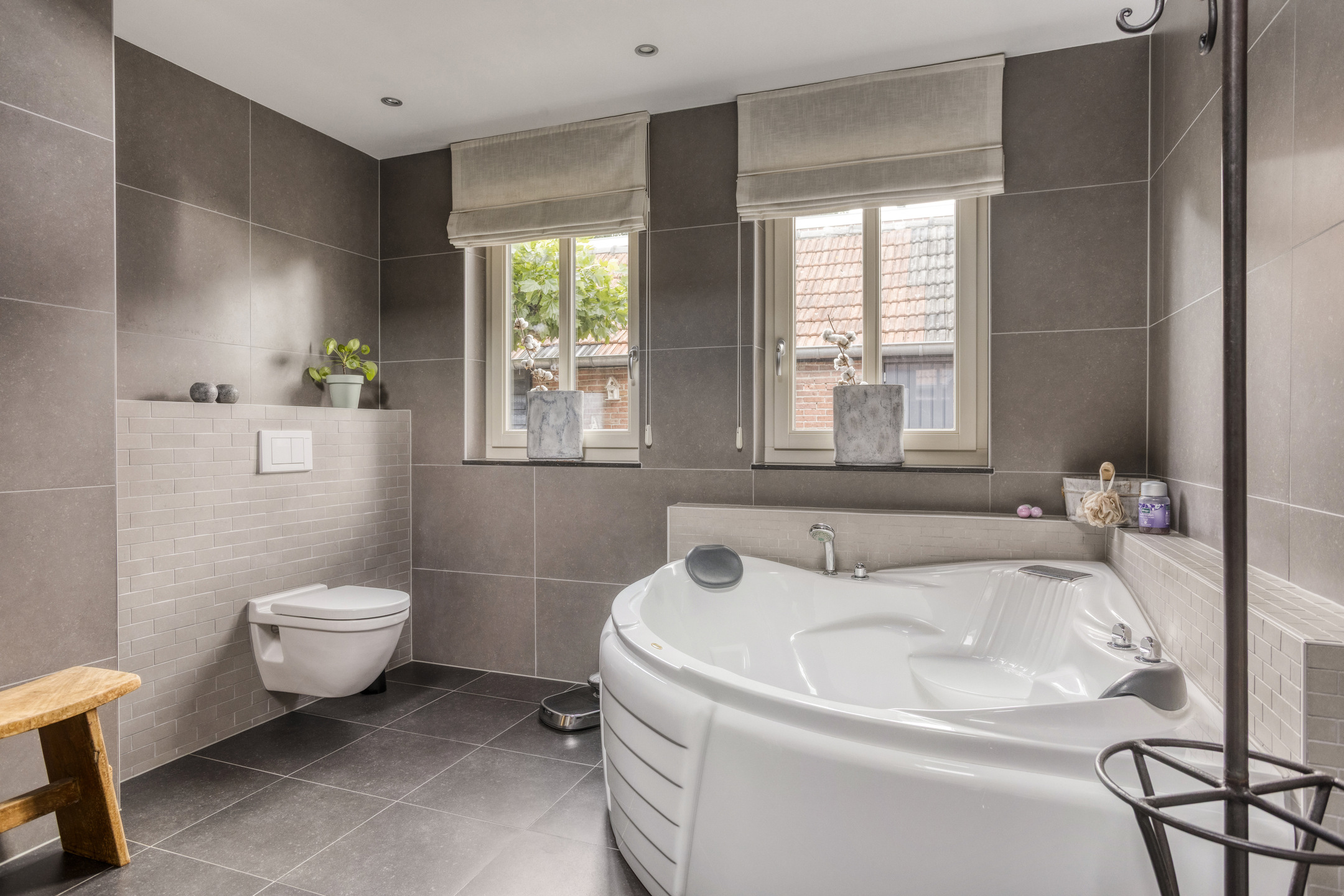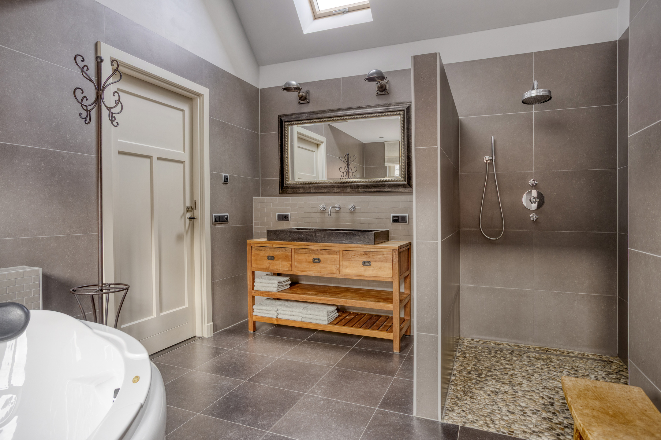 Achter de bijkeuken is de badkamer gelegen. De wanden en de vloer zijn volledig betegeld. De badkamer is compleet ingericht. Er is een rond ligbad, een inloopdouche, een wastafelmeubel met spiegel en een zwevend toilet. De badkamer heeft een luxe uitstraling.