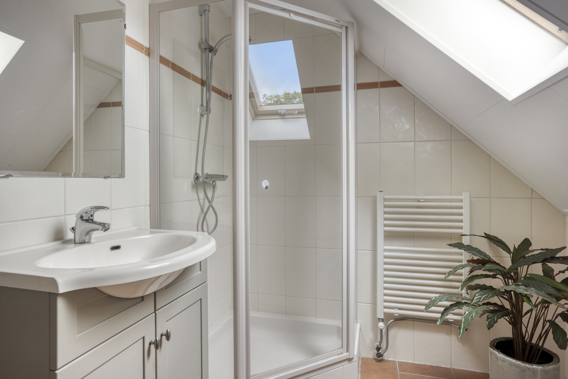 De badkamer is aan de achterkant van de woning gelegen. Hier is een douche, toilet en wastafelmeubel met spiegel. De wanden zijn volledig betegeld.