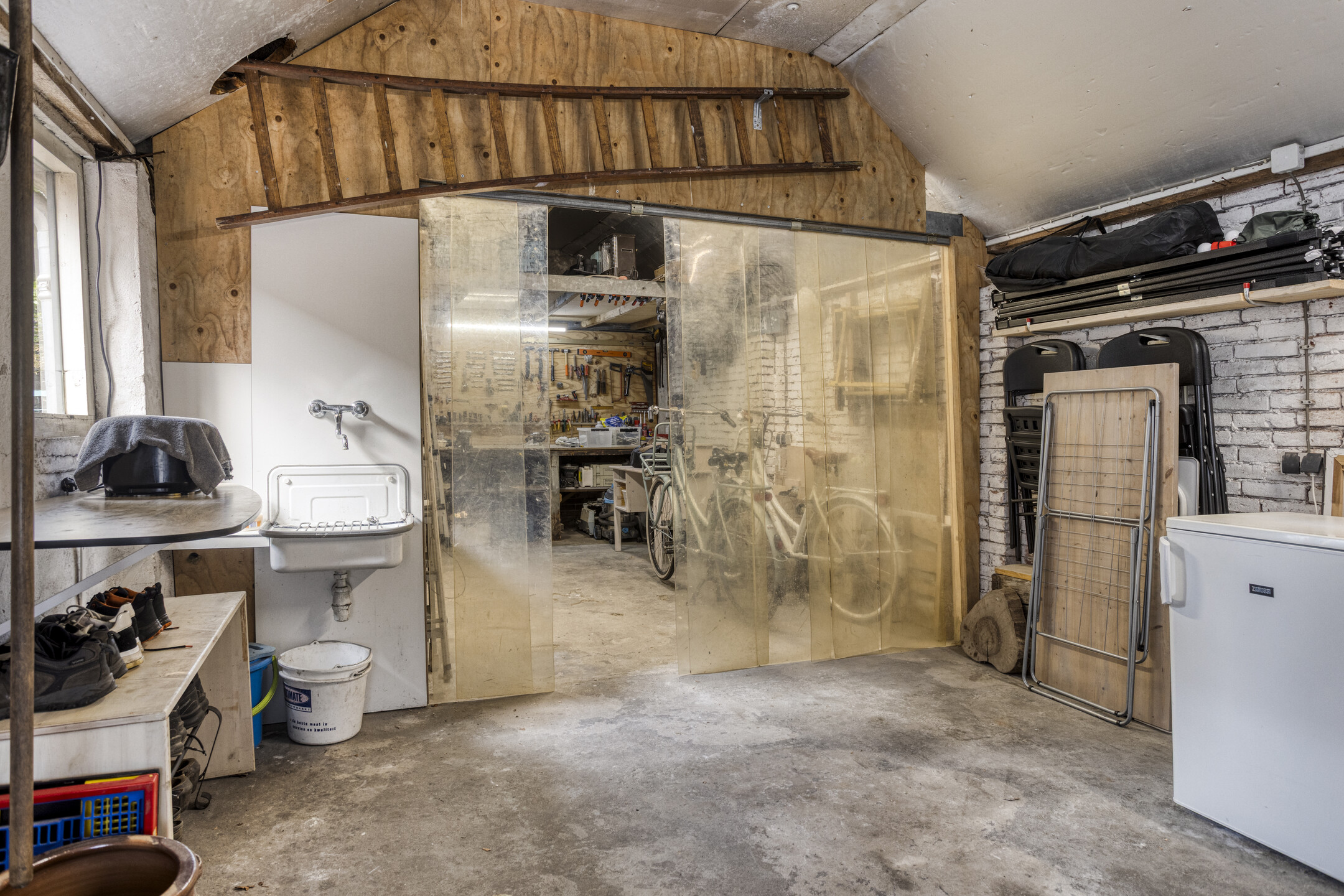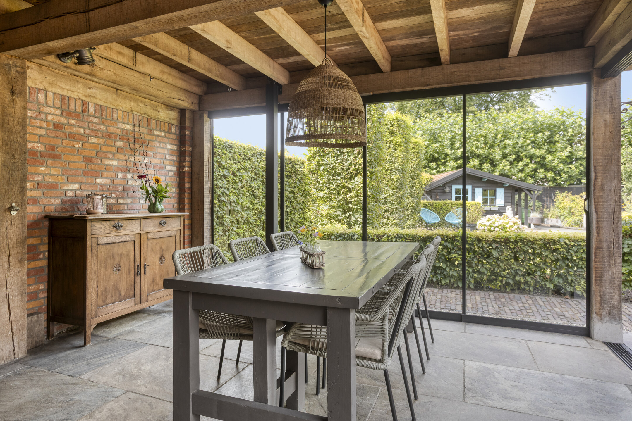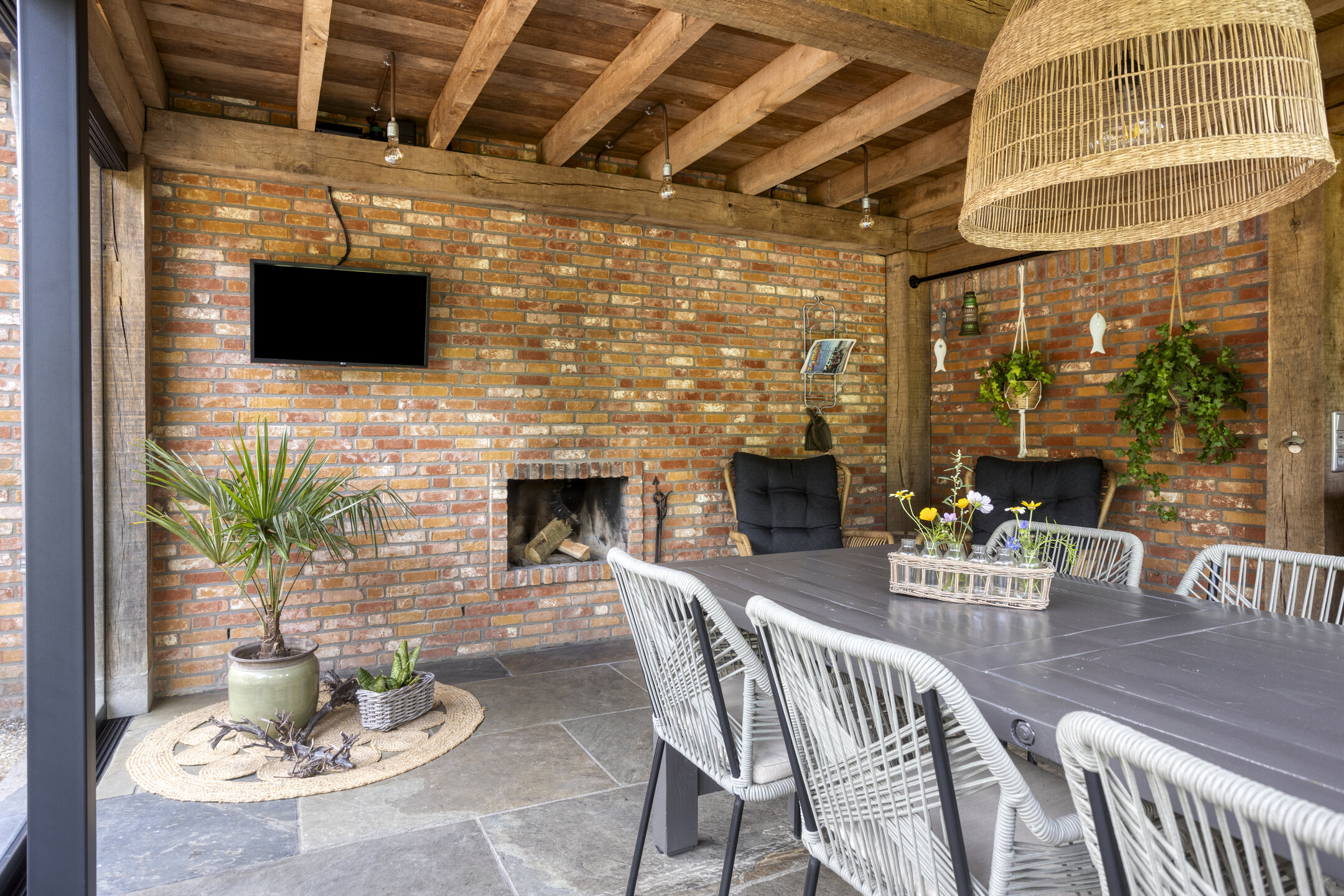 Achter de woning is de tuinkamer gelegen. Een heerlijke ruimte welke volledig is af te sluiten met een glazenschuifwand. De grote tegels in combinatie met het schoonmetselwerk en houten plafond maken het een heerlijke ruimte om met familie en vrienden te verblijven. Ook de openhaard draagt daar natuurlijk aan bij. Verder is deze ruimte voorzien van verlichting en elektra. Door de grote raampartijen hebben je een fantastisch zicht op de tuin.