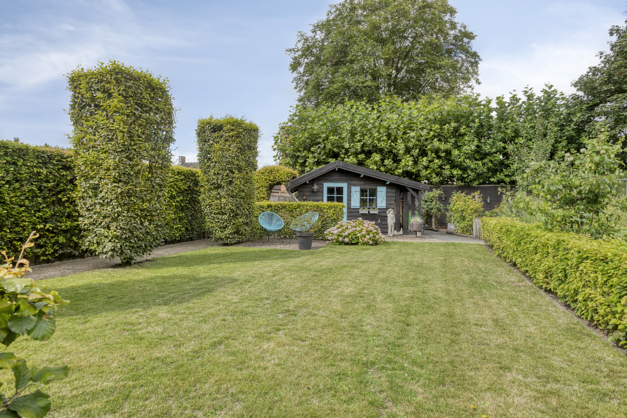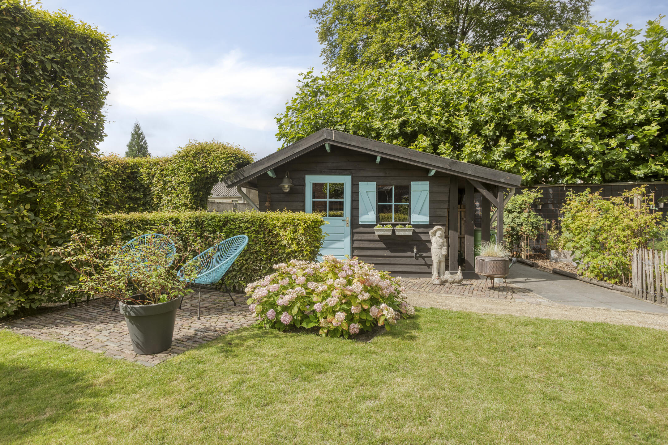 Achter de garage/berging is er een overkapping voor bijvoorbeeld houtopslag. De tuin is op het westen gelegen en is voorzien van diverse hagen en volwassen planten/bomen. Een groot deel van de tuin bestaat uit gazon. Het terras achter de woning is voorzien van straatwerk. De tuin biedt veel privacy.